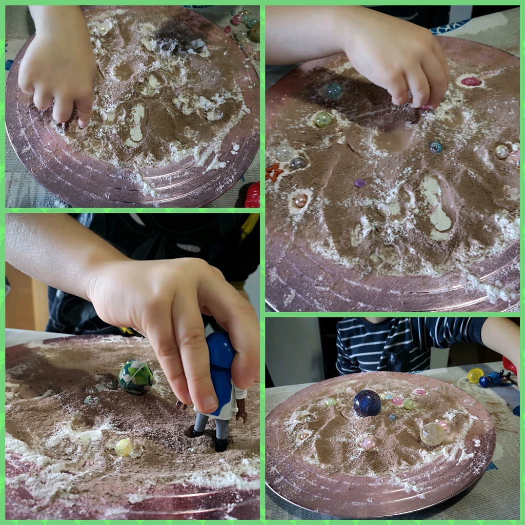 :Canicas de diferentes tamaños, bandeja, harina, colador y cacao en polvo.