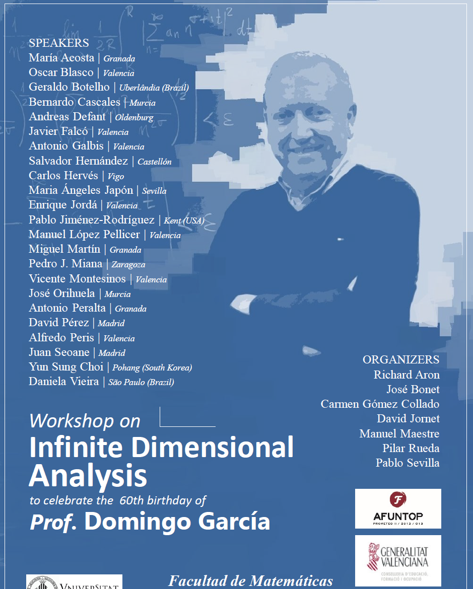 Domingo García es un matemático investigador internacionalmente conocido por sus contribuciones en Analisis complejo. Sus resultados están relacionados con los métodos asintóticos en varias variables complejas, polinomios sobre espacios de Banach, álgebras de funciones holomorfas y geometría no lineal de espacios de Banach.
