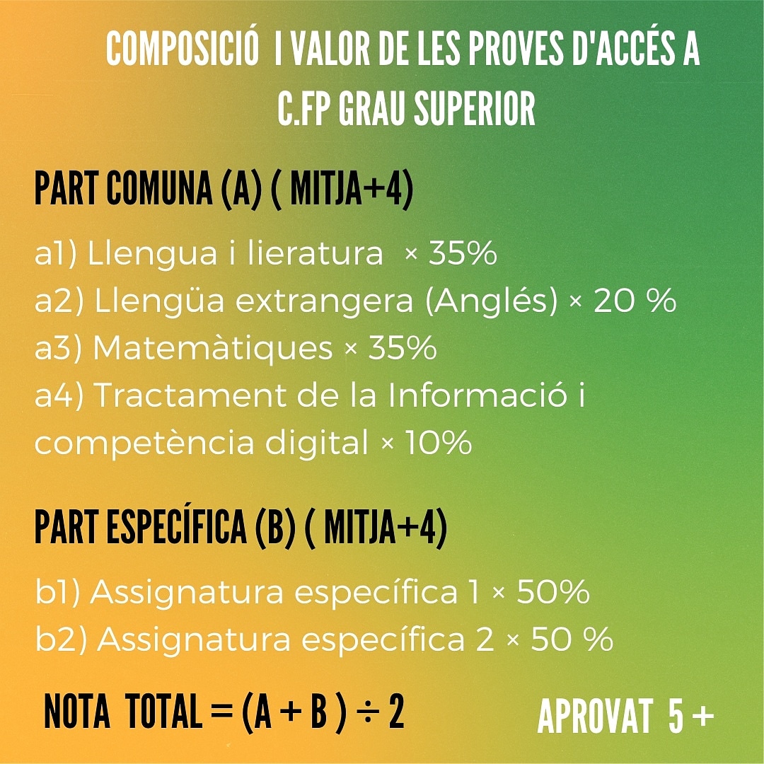 - Accés a les famílies professionals: Activitats Físiques i Esportives. Agrària. Imatge Personal. Indústries Alimentàries. Química. Sanitat. Seguretat i Medi Ambient.