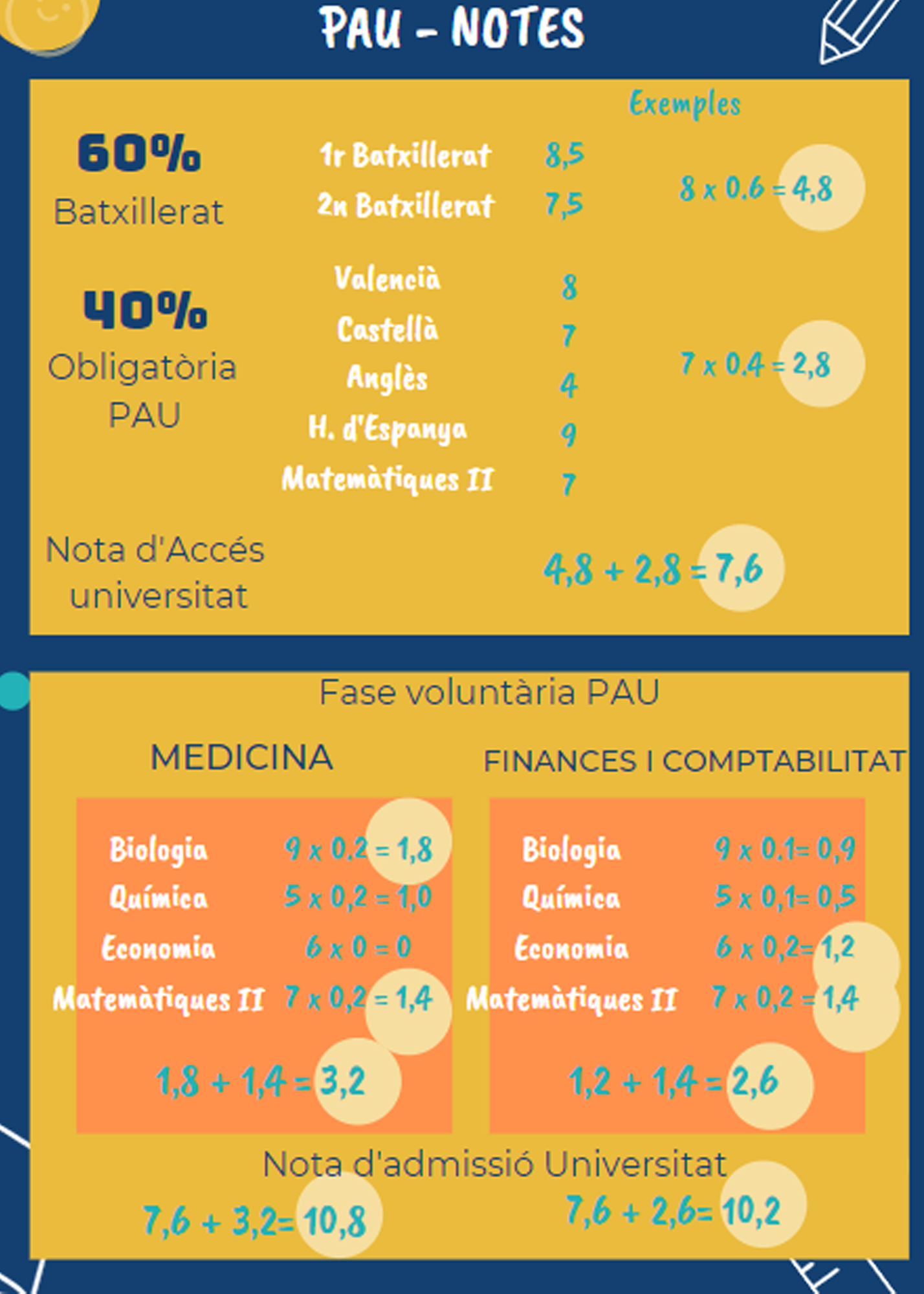 La nota de 1r de Batxillerat conta un 30% respecte a la Nota d’Accés a la Universitat.