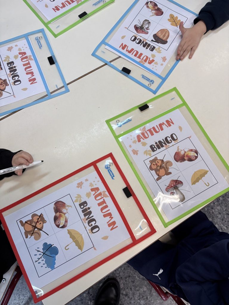 - Vocabulario: colours (red, yellow, brown, orange, green, blue) anda autumn elements (leaf, chestnut, mushroom, squirrel, acorn, umbrella, rain, boots)