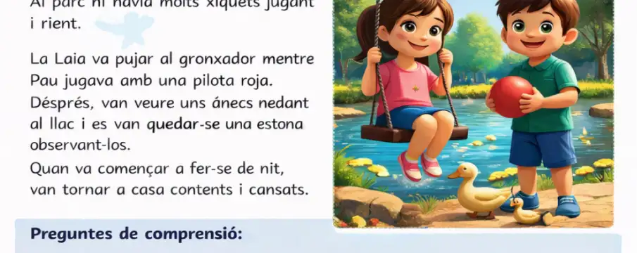 El gos corre al parc. La seua pilota favorita és a la boca i mou la cua feliç. Els xiquets riuen i juguen al sol. El cel és blau i l’aire és fresc. Quin dia més bonic!» L’abella