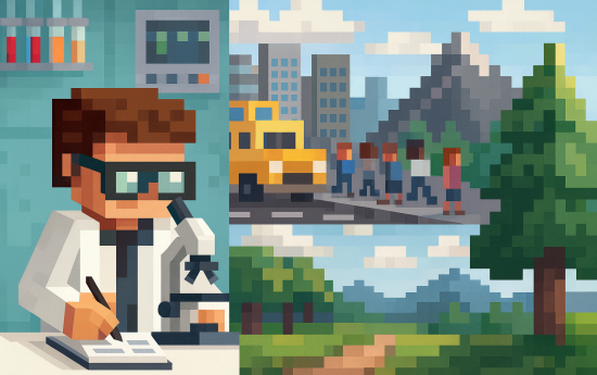 El científic treballa al seu laboratori amb una bata blanca i ulleres de protecció. Mira pel microscopi i anota les observacions en una llibreta. A la ciutat, el trànsit és intens i la gent