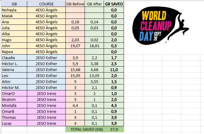 The three classes involved in the eTwinning elective are organizing this activity collaboratively. Esther’s class will be responsible for dissemination: they will compose several songs and select one to share on social media. Meanwhile, Àngels Pérez’s students will prepare and manage a calculation sheet to monitor the gigabytes (GB) deleted. Finally, my students (Irene’s class) will guide other students on how to clean up their class accounts on OneDrive, Outlook, and, optionally, their mobile phones.