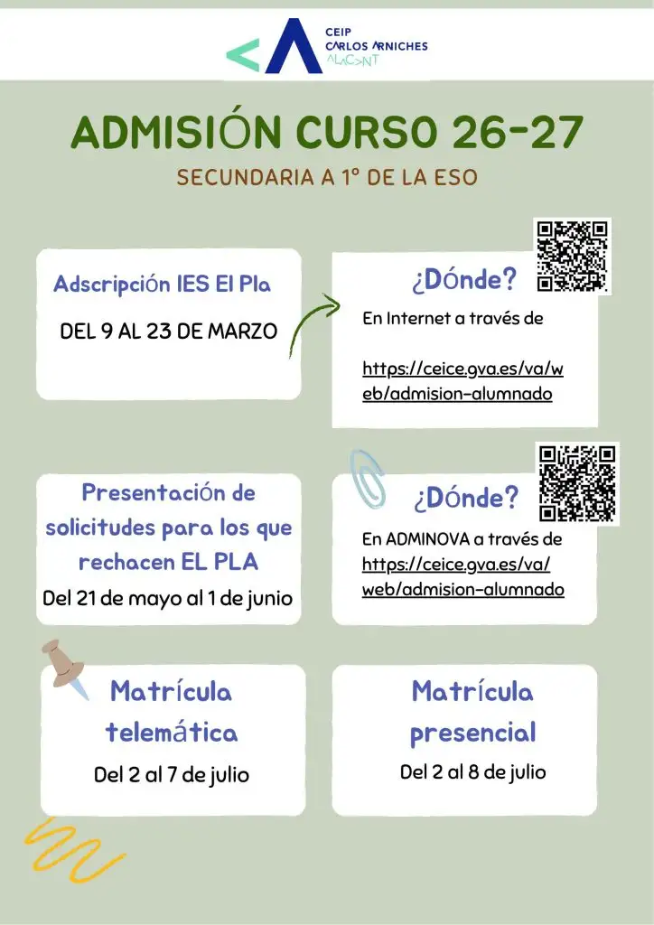En la primera opción (9 al 23 de Marzo) TODOS teneis que entrar o bien para confirmar que quereis la plaza (asignada en el IES EL PLA9) o que renunciais a ella, el siguiente plazo (21 de Mayo al 1 de Junio) saldran las vacantes en cada centro y entonces los que no hayan pedido en EL PLA , SOLICITARAN NUEVO CENTRO.