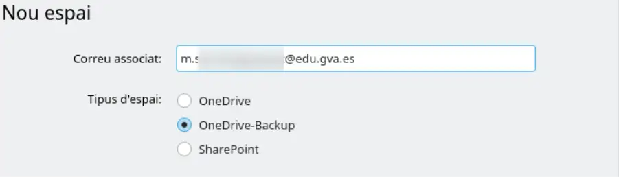 Com a l’espai se li pot donar diversos usos, us hem preparat un selector perquè pugueu triar entre usar-lo com a còpia de seguretat (còpia de seguretat) o per a sincronitzar el contingut de totes o part de les carpetes del vostre espai personal (OneDrive) o d’un espai compartit (SharePoint) en l’ordinador. L’accés es fa a través de la Identitat Digital (comptes @edu.gva.es).