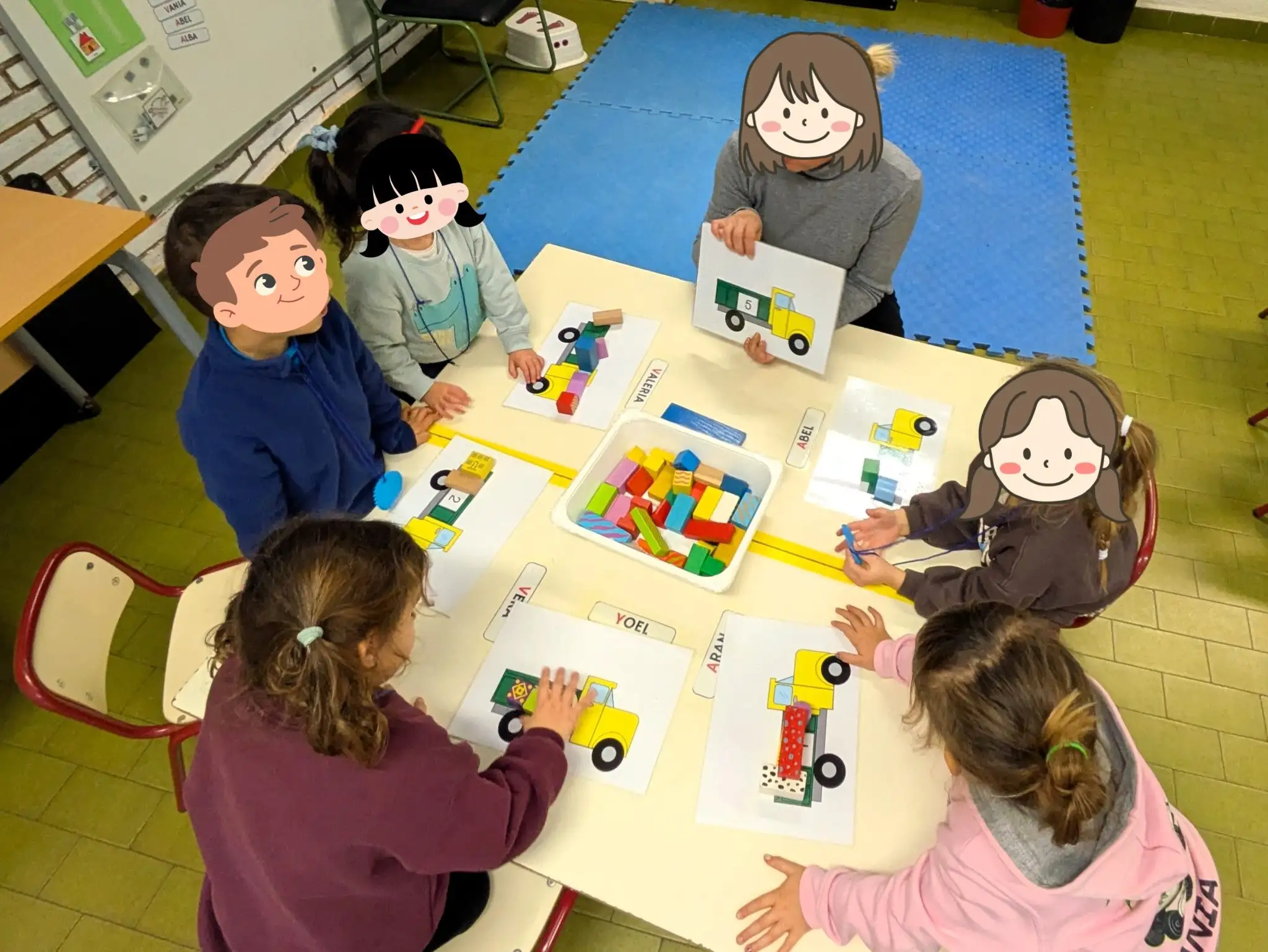Hem «cordat» figures geomètriques, hem carregat camions amb peces de fusta i hem construït ninos de neu amb boles en les quals posàvem les lletres dels nostres noms.