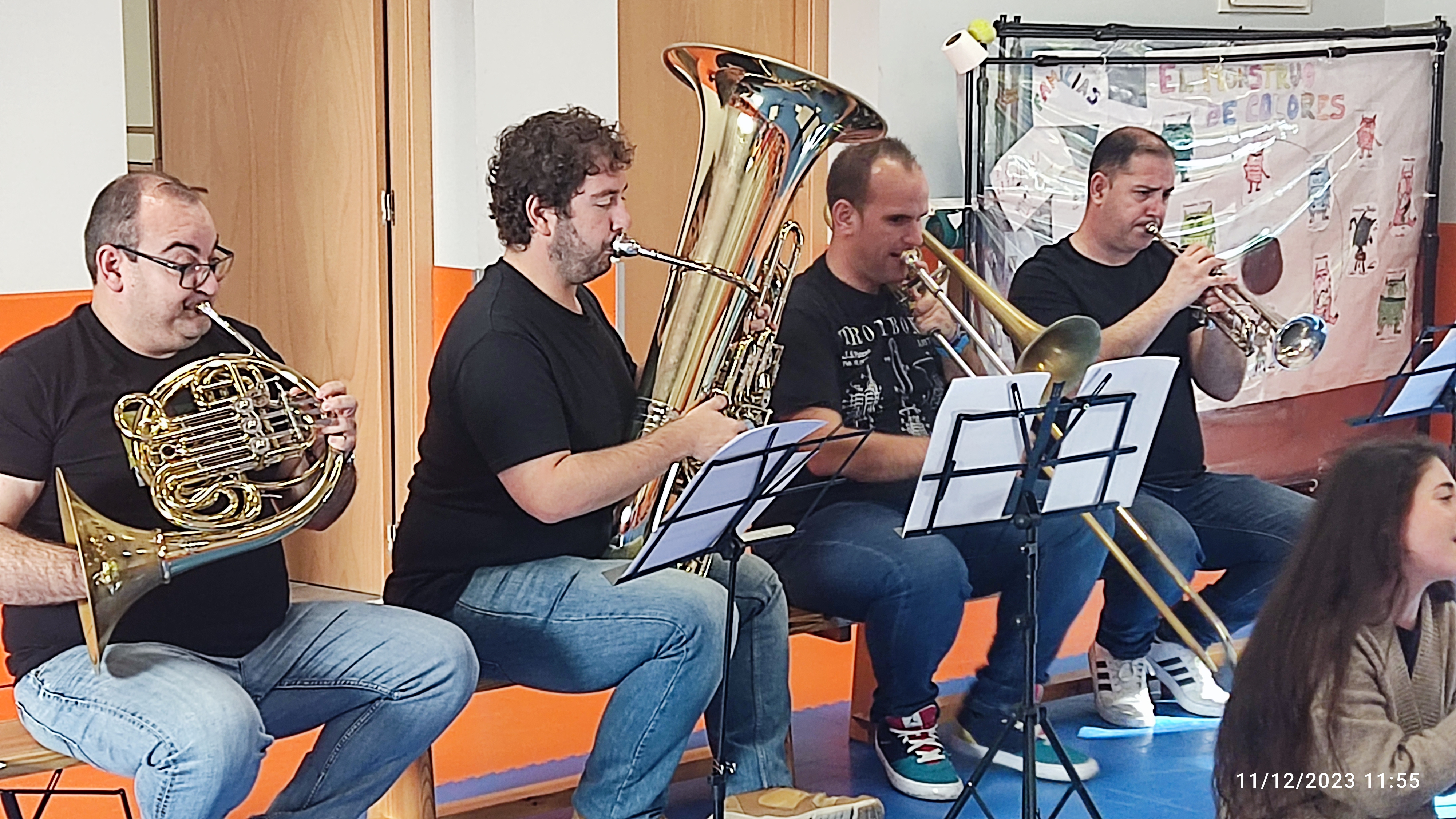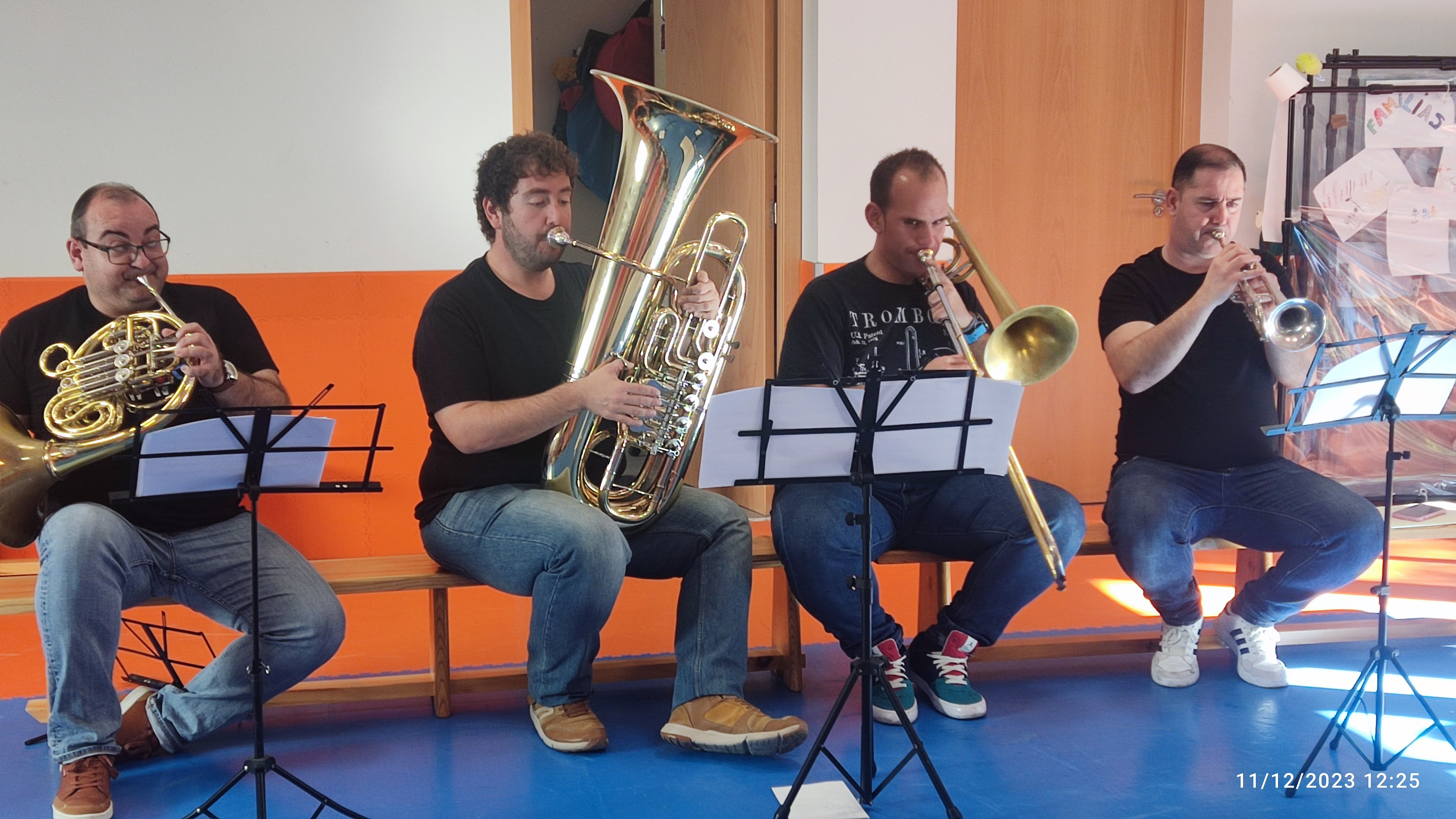 El lunes 11 de diciembre tuvimos la suerte de recibir la visita por parte de la familia de instrumentos de Viento Metal de la Escuela de Música de Sant Joan, para compartir con el alumnado de Infantil su proyecto «Més a prop de la música». Durante la sesión les explicaron de forma muy lúdica y cercana los diversos instrumentos, y les contaron un cuento navideño amenizado con villancicos tan conocidos para ellos como Rodolfo el reno.