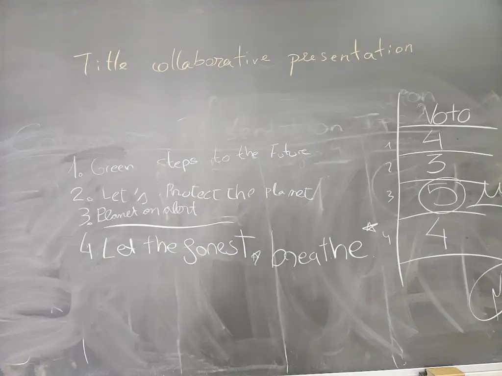 Dear partners, the voting for the title of our collaborative presentation has ended. “Planet on alert” was chosen as the title of our collaborative presentation with 5 votes from our students. Here are the voting results: