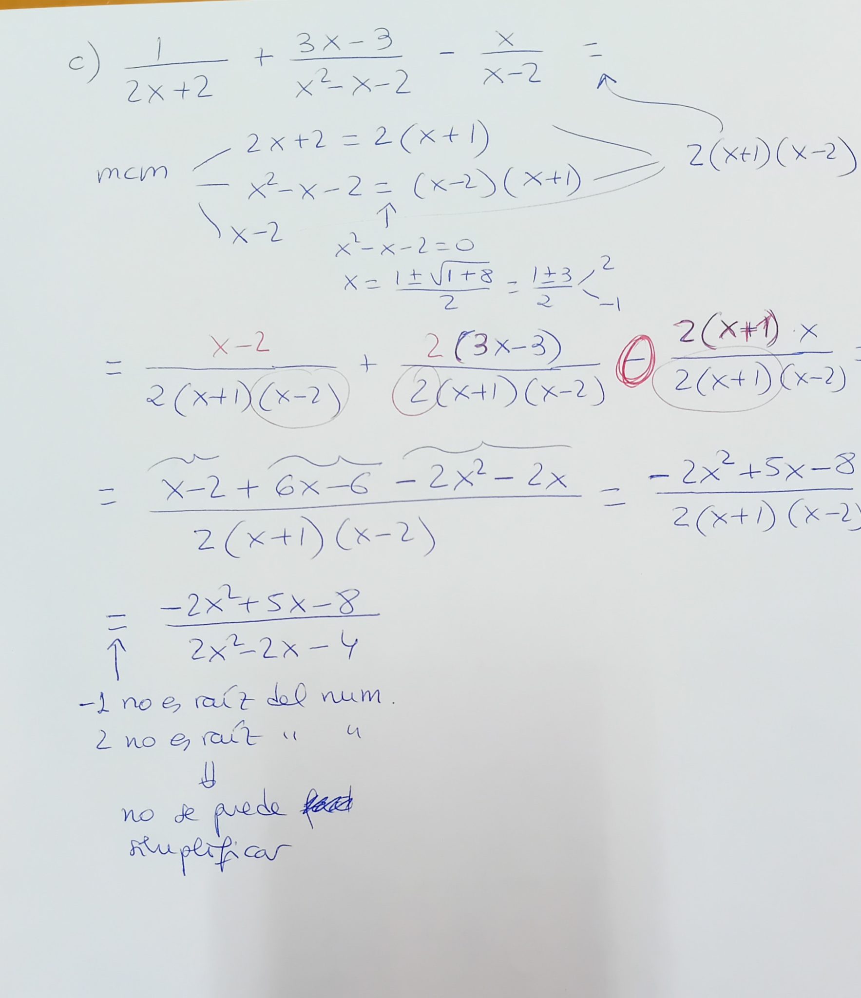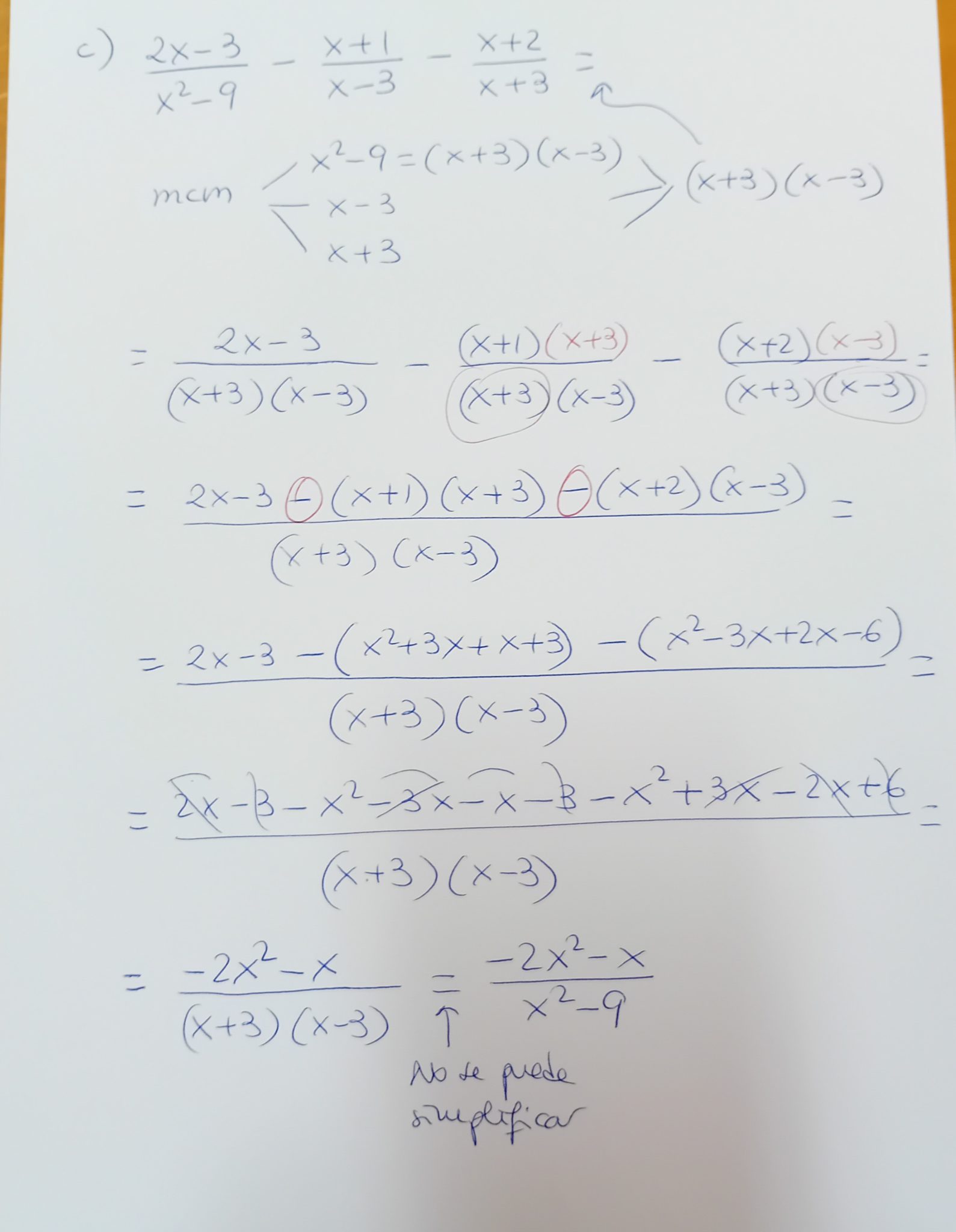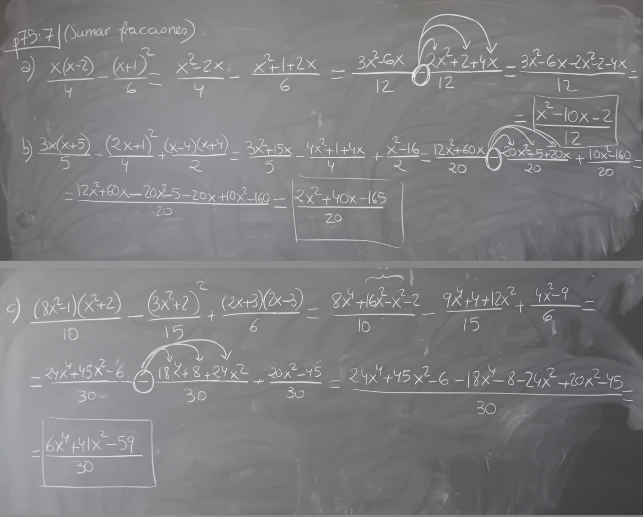 4º.- Sumar/restar los numeradores, manteniendo el denominador común que hemos calculado al principio. Es probable que en este paso, en el numerador común haya que hacer varias multiplicaciones y reducir al final el polinomio del numerador.