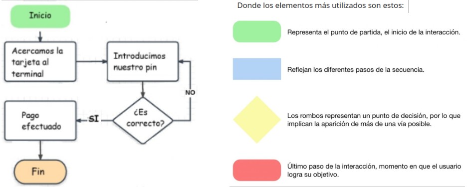 Una vez tenemos los pasos descritos, podemos hacer la representación gráfica de estos en el siguiente flujo (se muestran también los elementos más utilizados:
