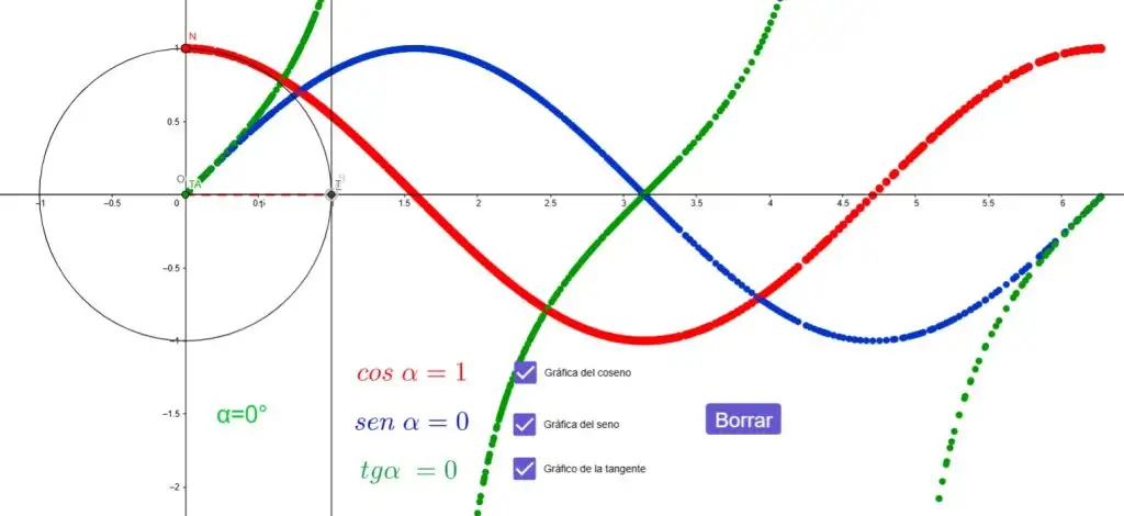 Si pinchas en el siguiente gráfico, se abrirá una ventana de Geogebra con la que puedes ver en una gráfica los valores que toman el coseno, el seno y la tangente a medida que cambia el ángulo (funciones cos(x), sen(x) y tg(x)).