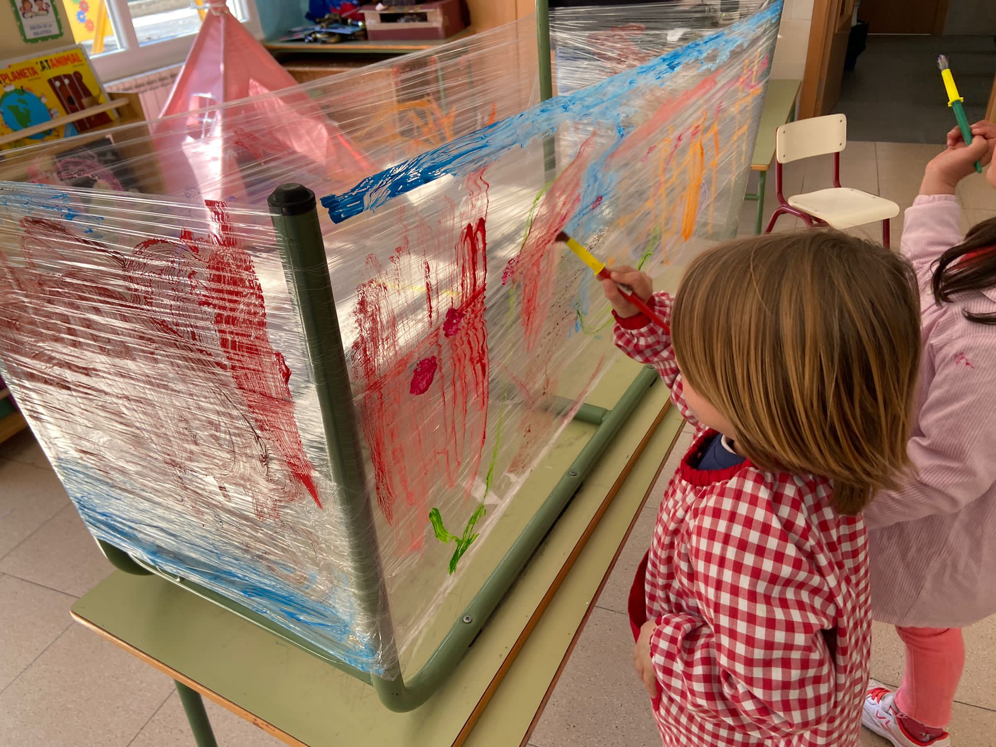 El arte forma parte del desarrollo integral y les permite potenciar su creatividad e imaginación, además de ser motor de comunicación en estas edades tempranas. En el aula de Infantil nos encanta experimentar con diferentes materiales, soportes, texturas…En este caso os mostramos cómo hemos pintado con témpera sobre film. Las posibilidades expresivas del arte son infinitas.