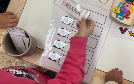 Además del nombre propio, también trabajamos el reconocimiento del nombre de los compañeros. Desde el inicio de curso hemos ido reconociendo nombres en la asamblea y ahora hemos introducidos otras