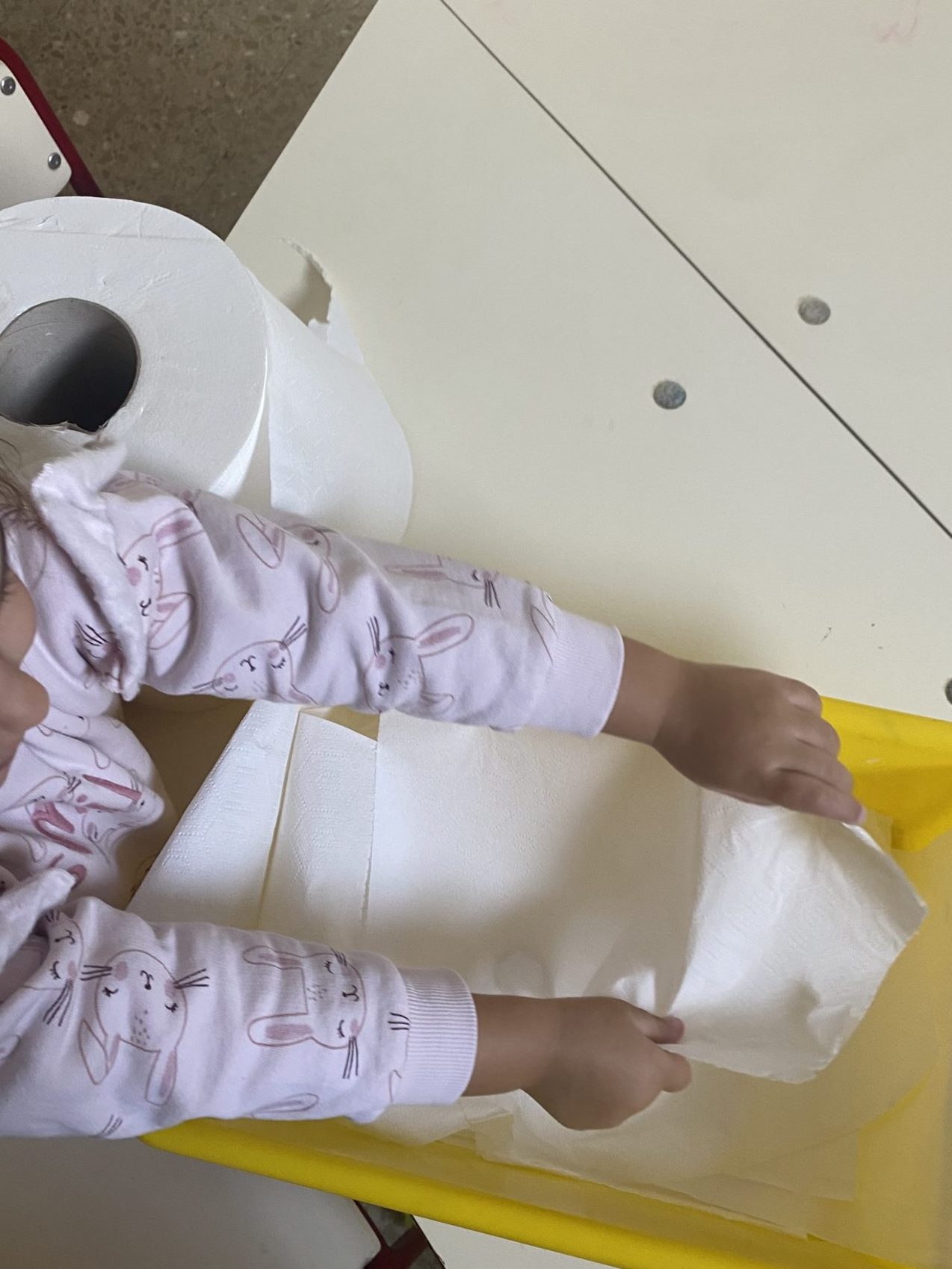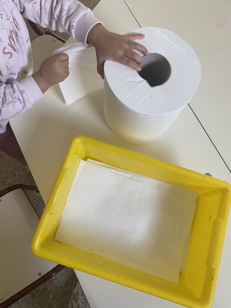 Para facilitar la autonomía en el baño, dejamos preparada una bandeja con papel cortado por lo que son numerosas las ocasiones en las que los niños y las niñas ven como los adultos preparamos esta bandeja cortando trozos de papel. Y así, a partir del ejemplo, de repente y de forma inesperada, un día que la bandeja se quedó vacía y el rollo de papel estaba a su alcance…se pusieron a cortar los trozos de papel y dejar preparada la bandeja de papel.
