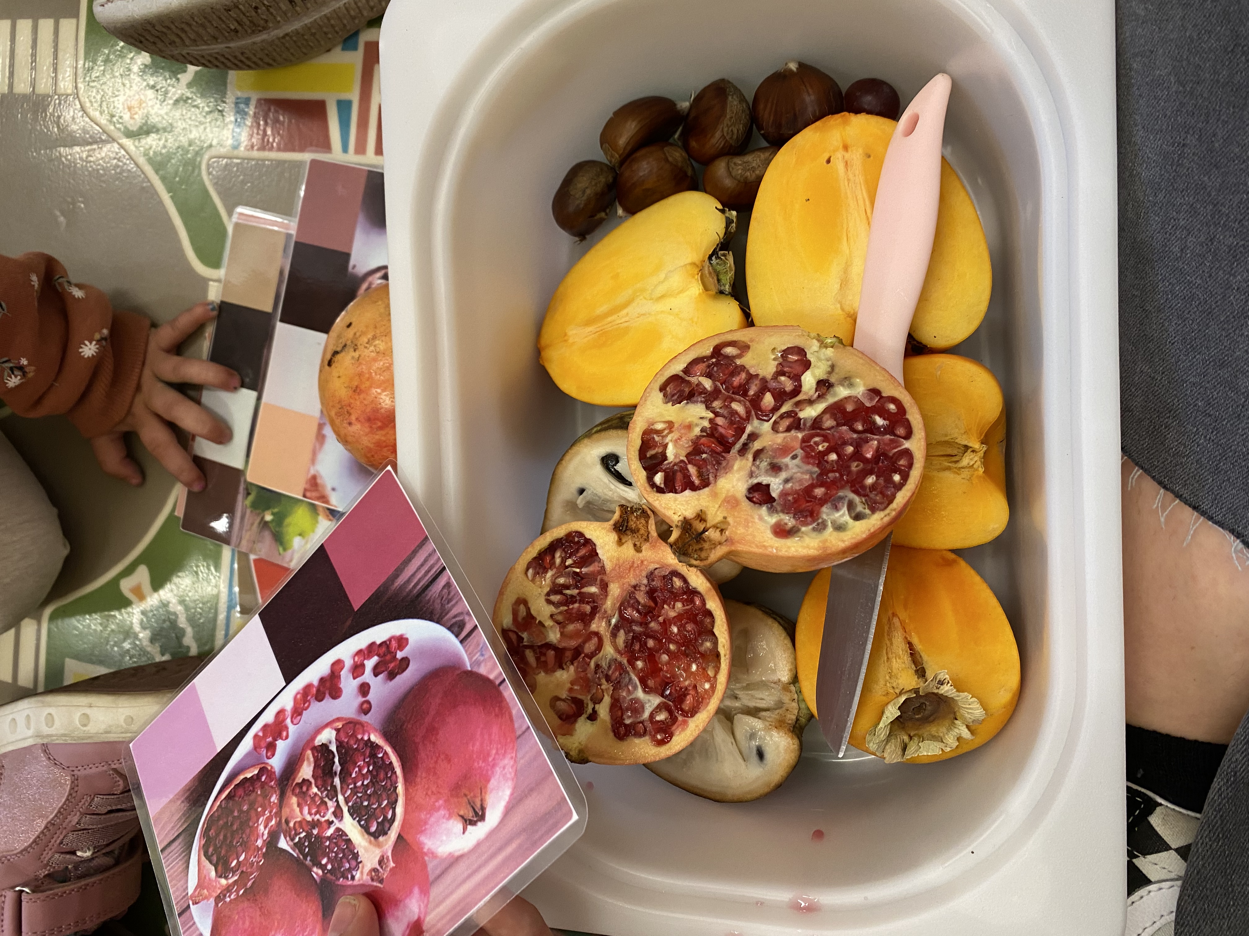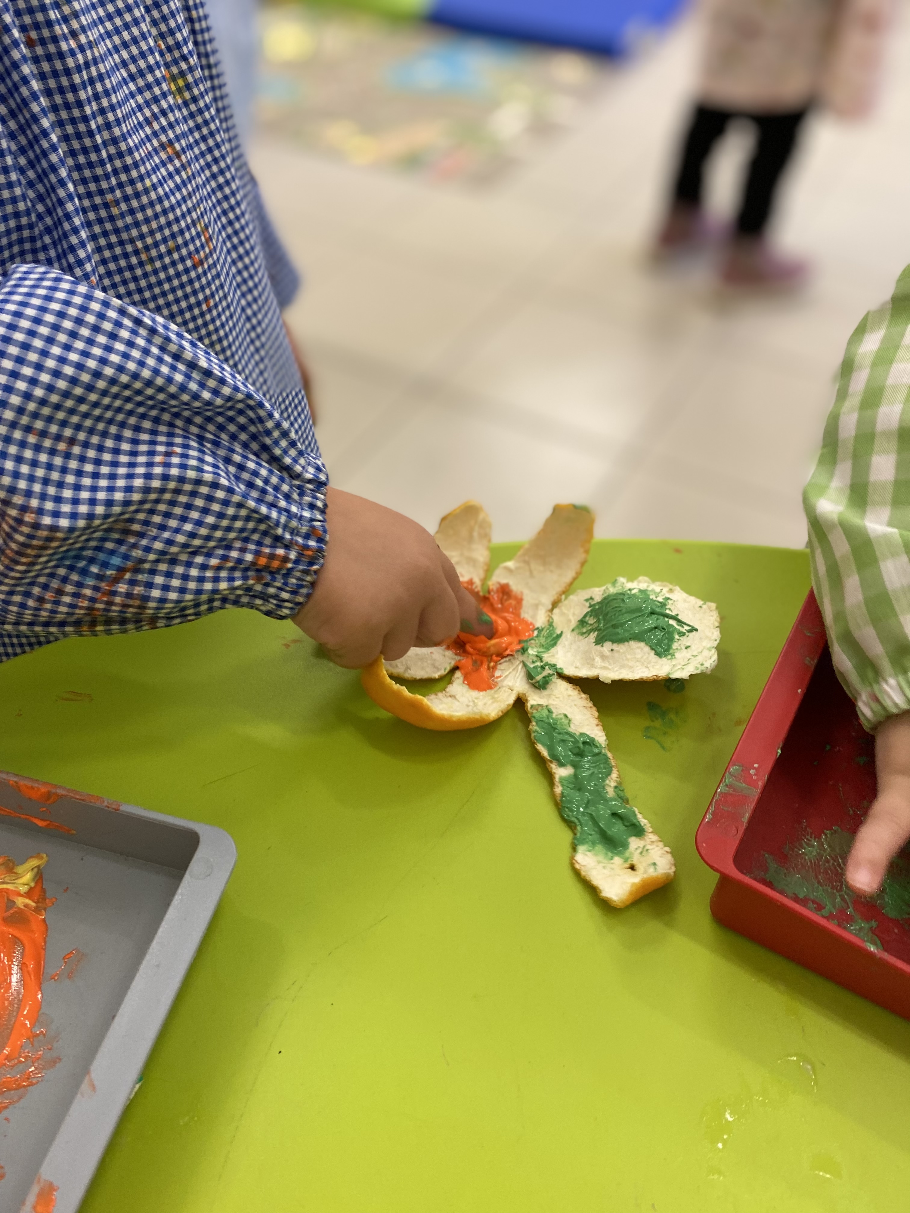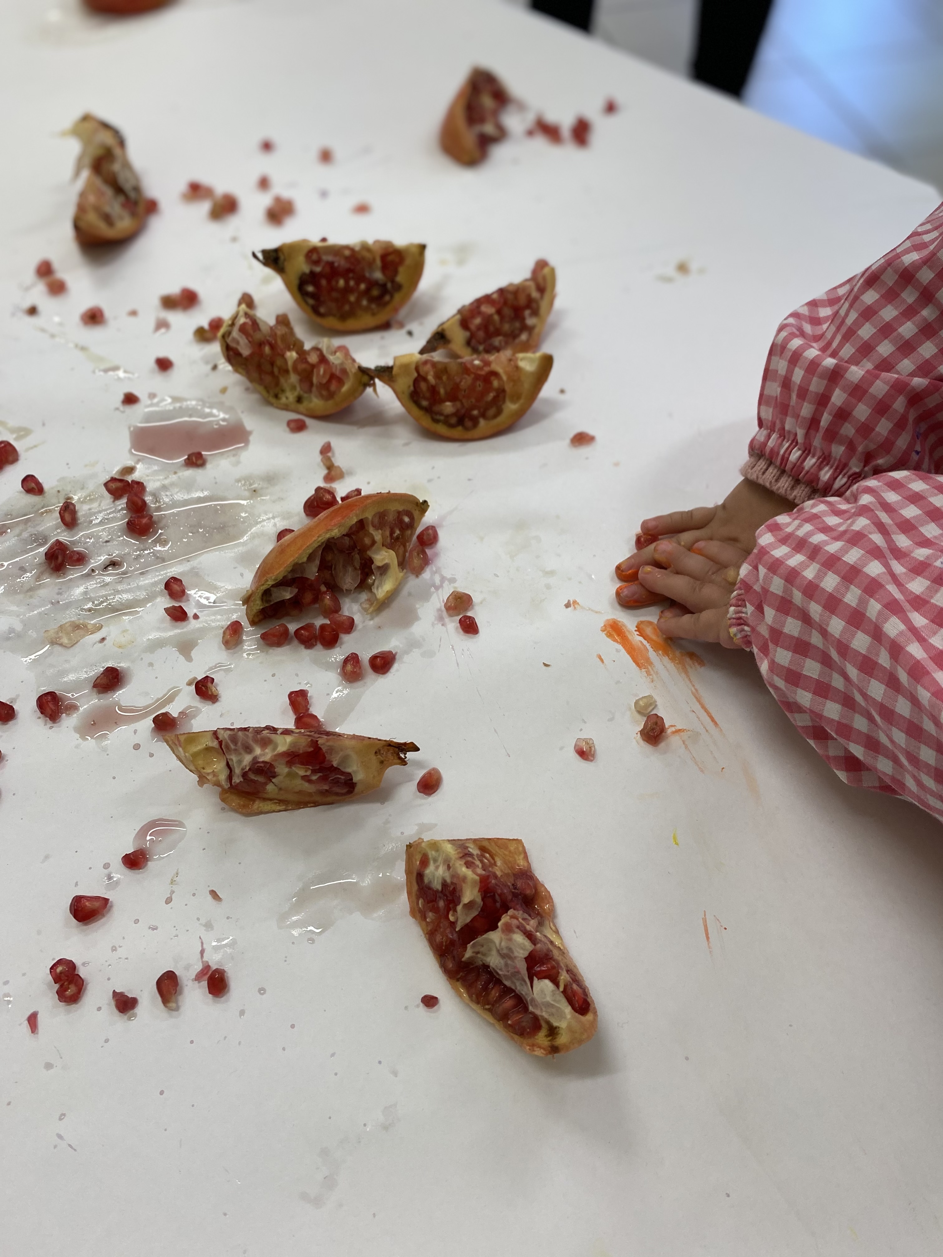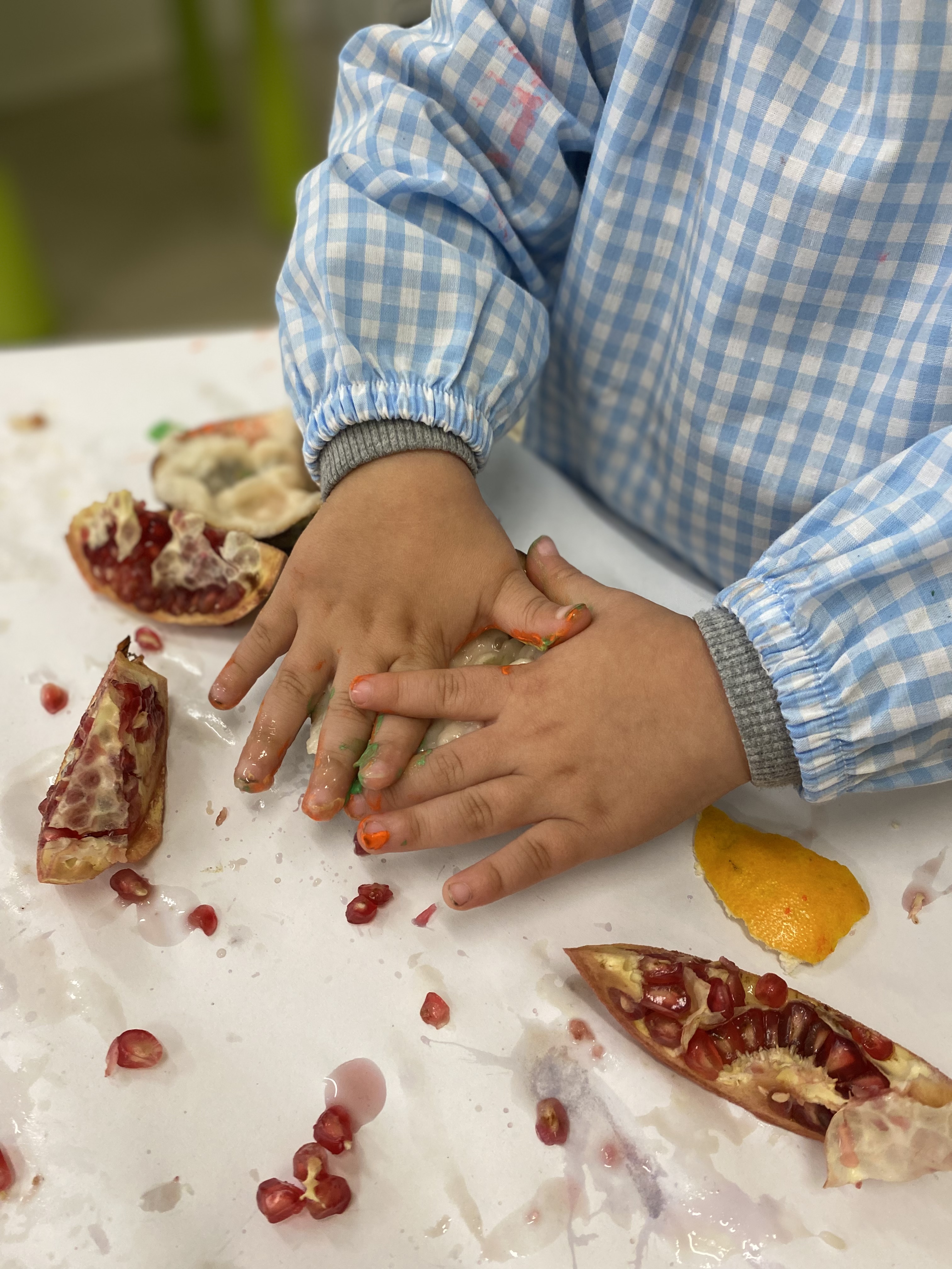Hui hem celebrat la festa de la tardor. En arribar a l’aula hem trobat diferents fruites de temporada i les hem explorat, descobrint alguna de les seves característiques com la forma, el color i les seues diferents grandàries. Després, en assemblea hem descobert el seu interior. Finalment hem experimentat amb les seves textures i hem estampat pintura amb elles.