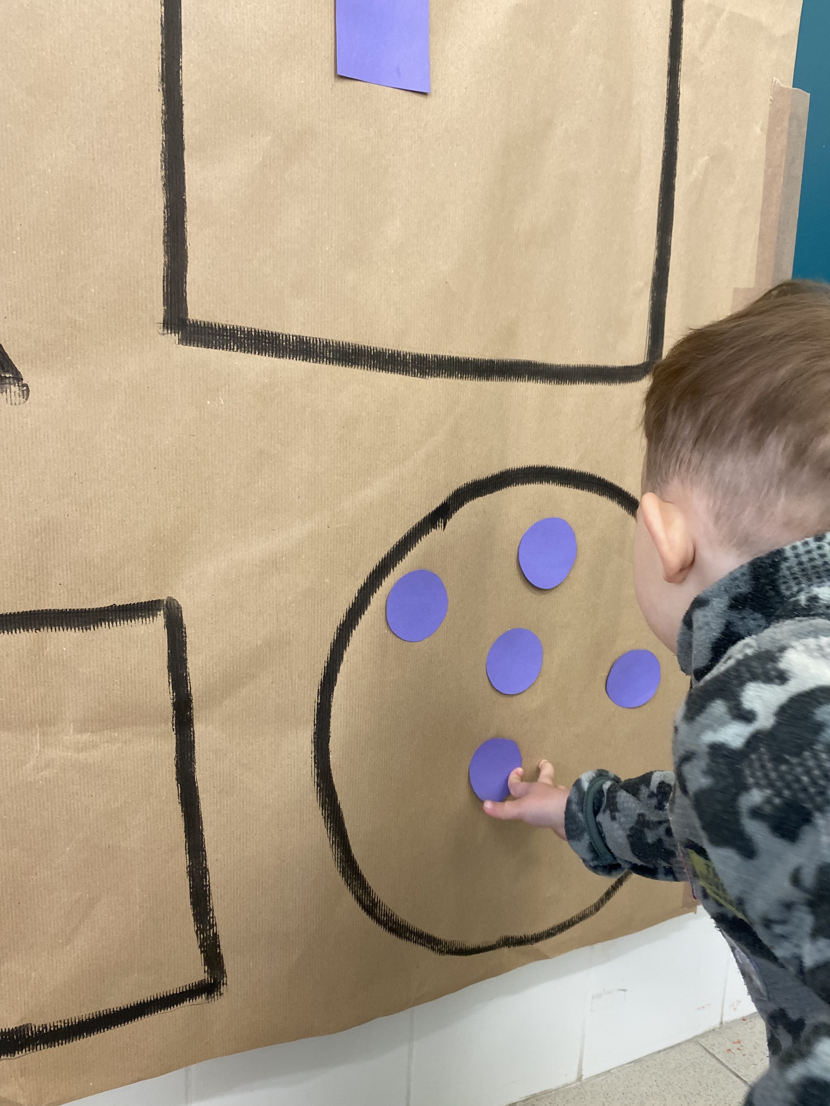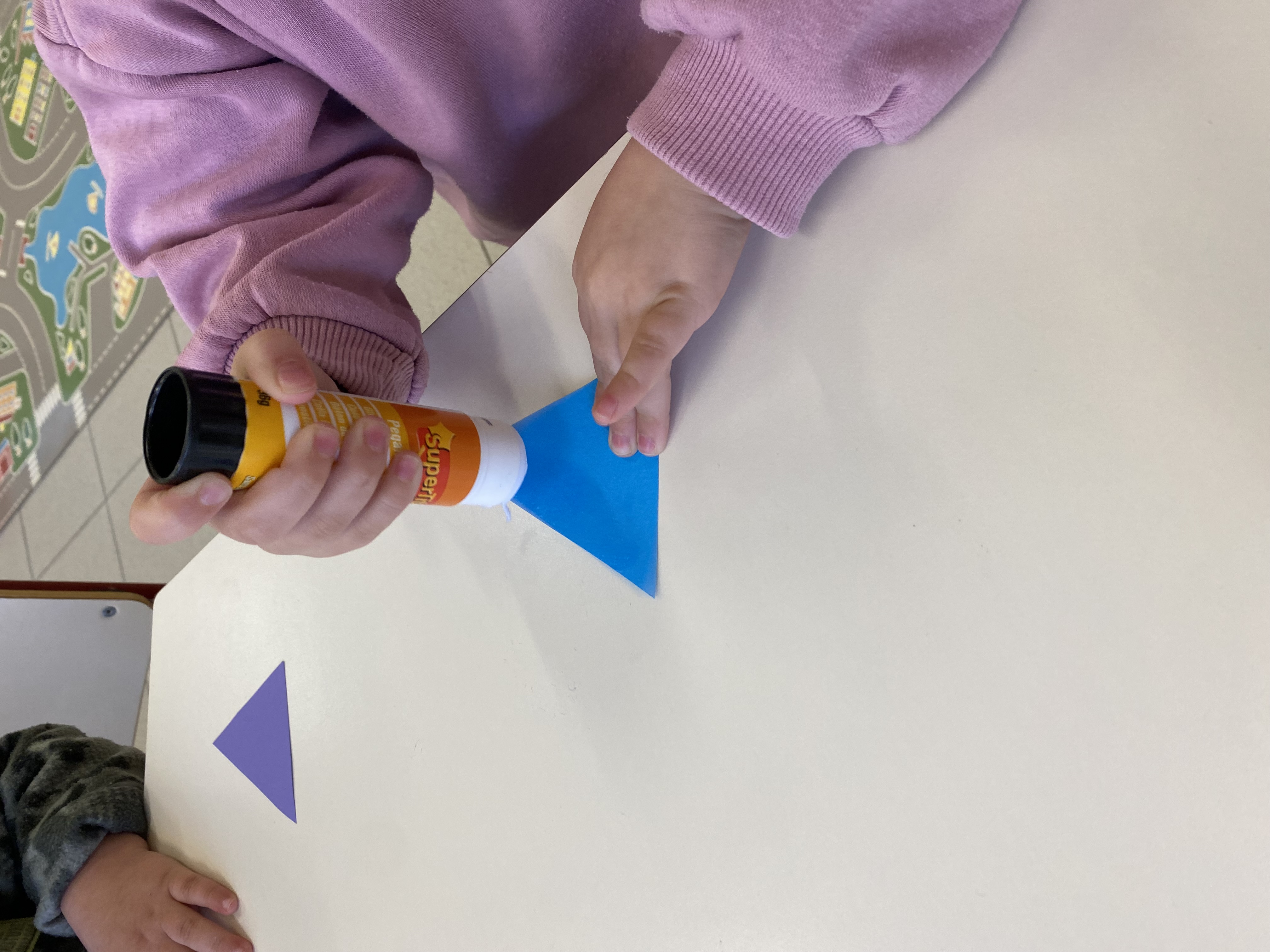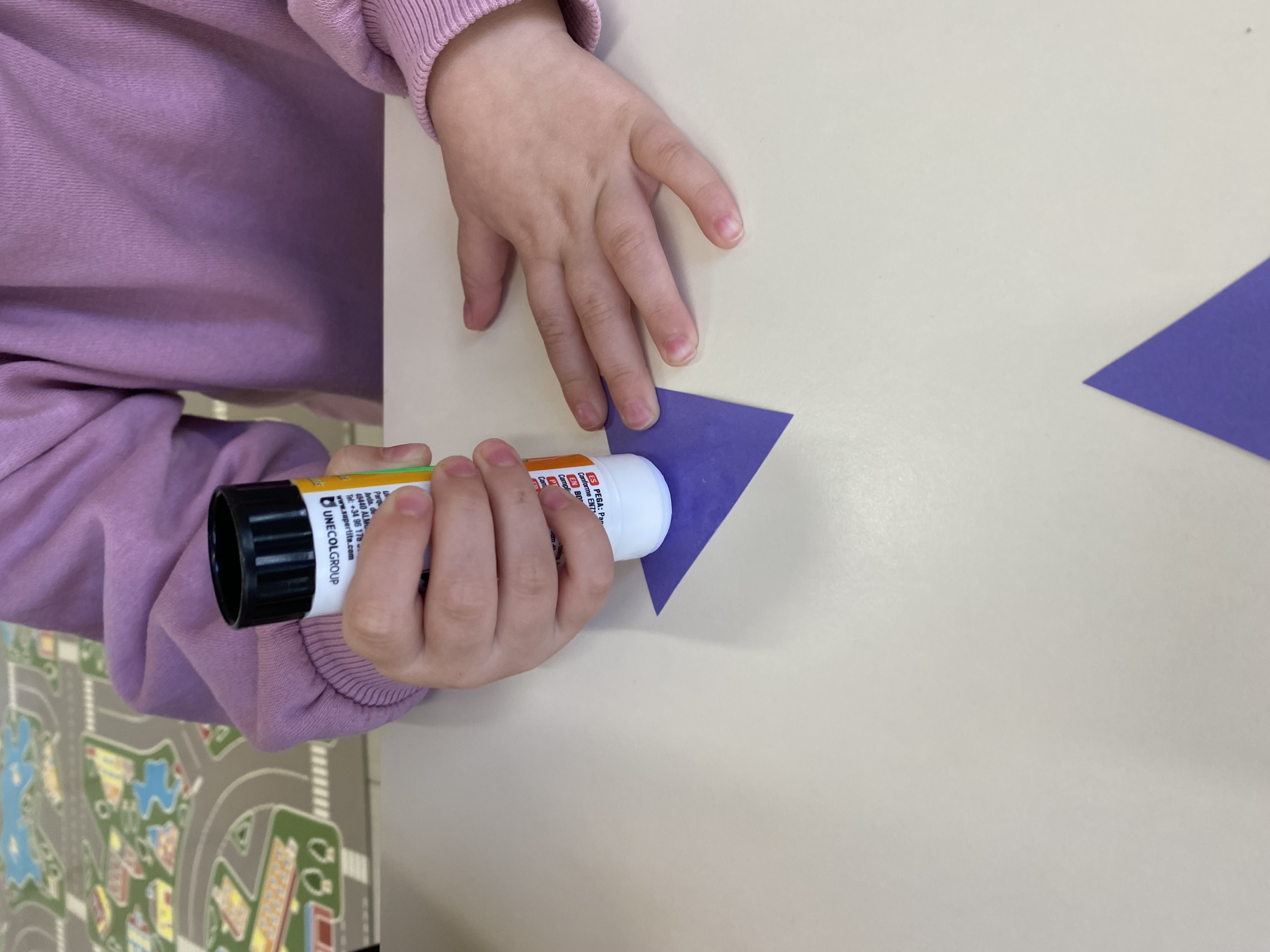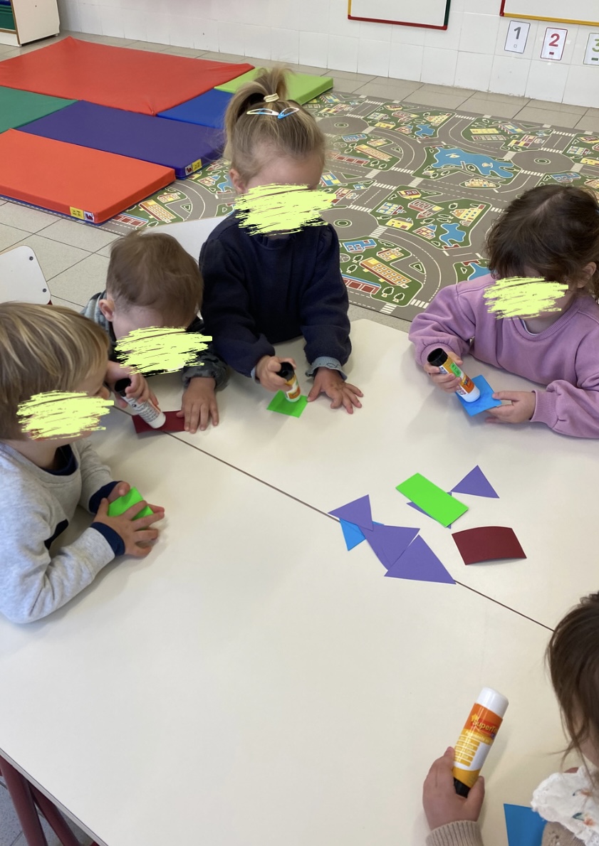 Relacionem figures geomètriques i ens iniciem en l’ús del pegament. A més, amb aquesta proposta afavorim el treball col·laboratiu, l’espera, la paciència i la necessitat i importància de compartir amb els pegaments.
