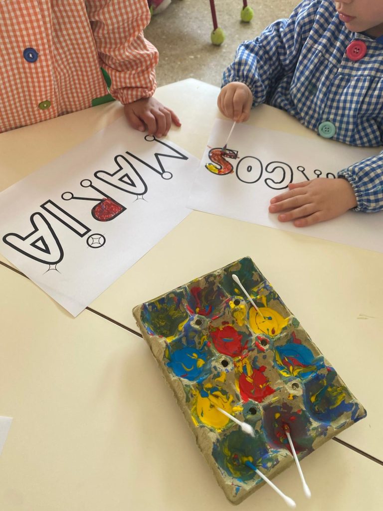 En estas imágenes podéis ver algunas de las propuestas que realizamos a partir de su nombre propio. El arte de Miró, la técnica del punteado, actividades en asamblea, descubrir sus iniciales…
