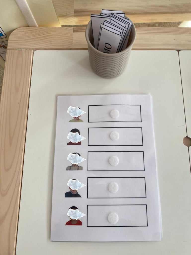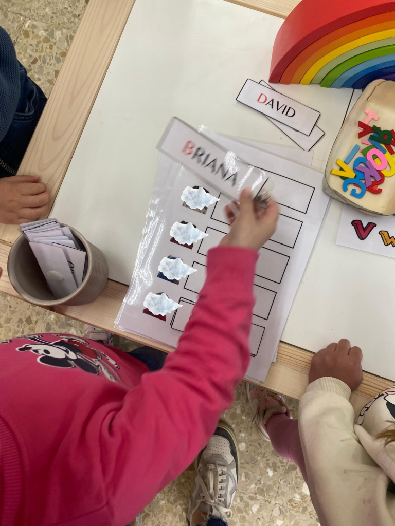 Además del nombre propio, también trabajamos el reconocimiento del nombre de los compañeros. Desde el inicio de curso hemos ido reconociendo nombres en la asamblea y ahora hemos introducidos otras propuestas manipulativas: