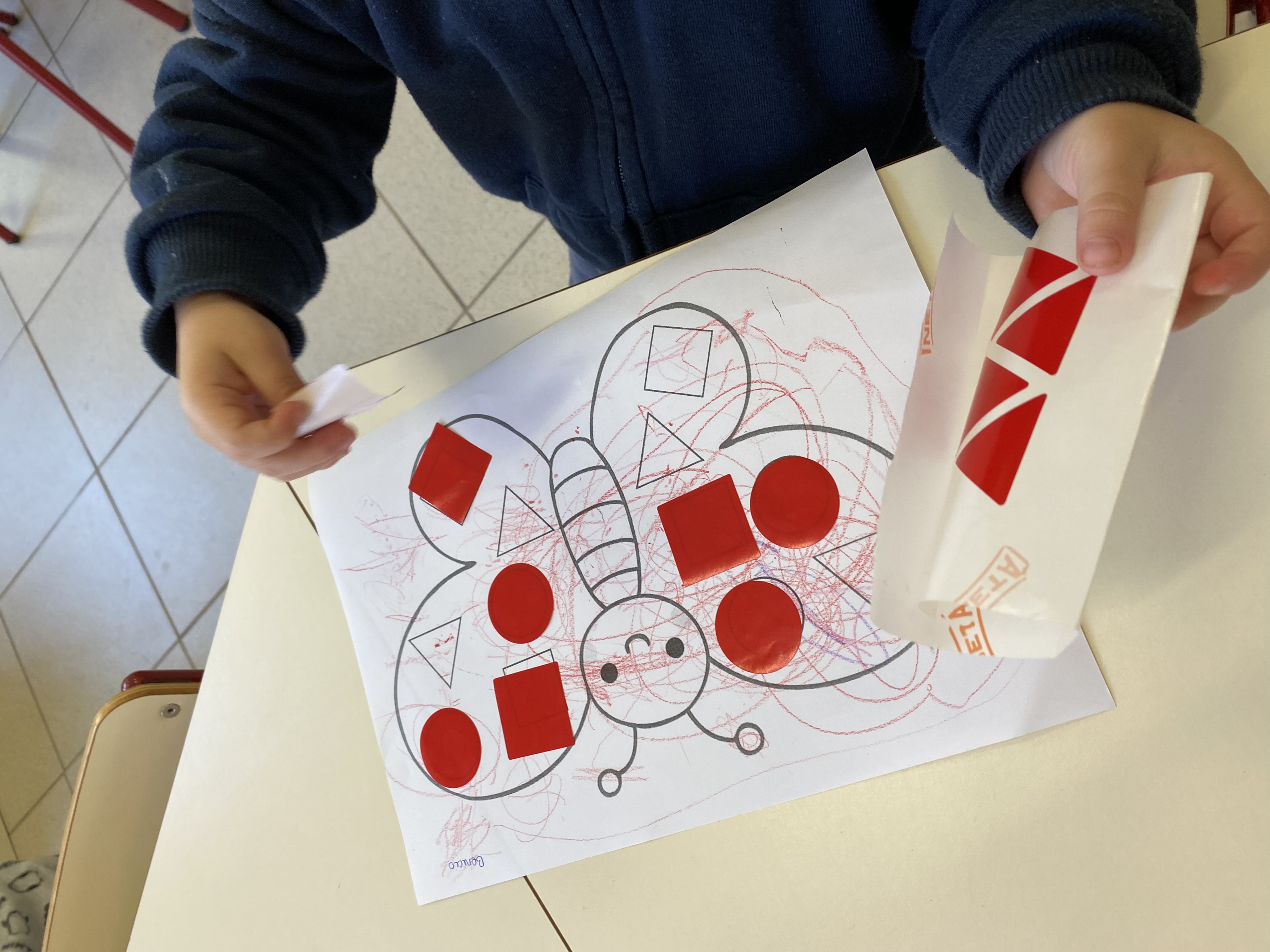 I hem fet dos treballs en paper amb gomets, relacionant formes geométriques, estimulant la motricitat fina, afavorint la coordinació mà-ull…Ho hem fet de meravella.