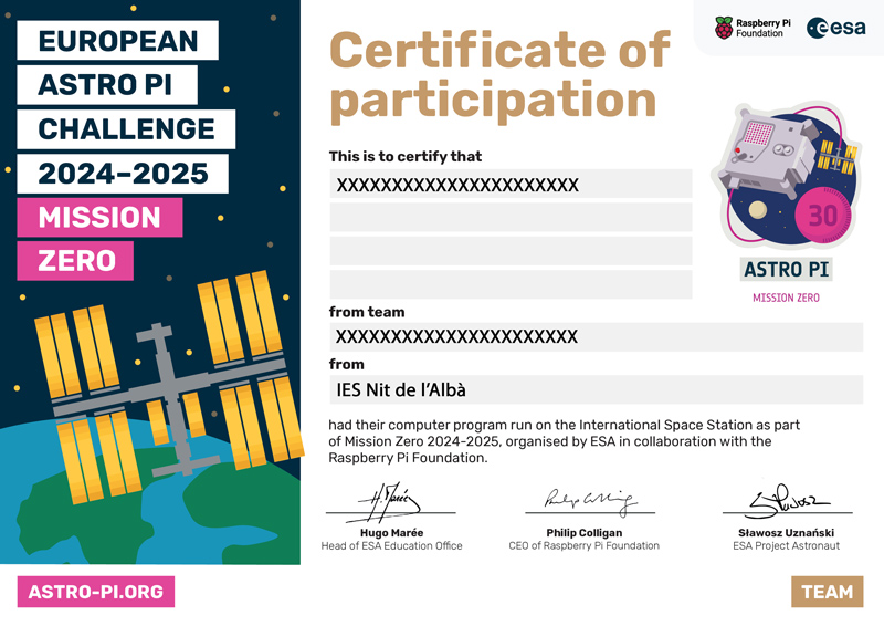 Durante el mes de mayo, los programas desarrollados por los alumnos y alumnas del IES Nit de l’Albà se ejecutaron en los ordenadores Astro Pi a bordo de la ISS, mientras la estación orbitaba la Tierra a más de 28.000 km/h. Tras esa experiencia única, cada participante ha recibido su certificado oficial de participación, donde se acredita el nombre del alumno, el equipo al que pertenecía y, lo más emocionante, las coordenadas exactas sobre las que se encontraba la estación mientras su código estaba en funcionamiento.