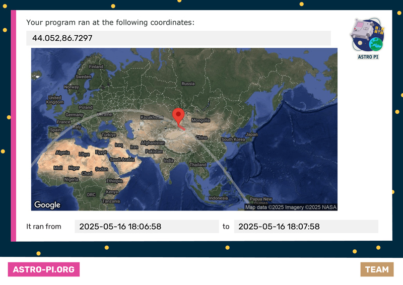 Por ejemplo, uno de los certificados recibidos muestra que el programa del equipo ejecutado por estudiantes de 2º de ESO se corrió sobre las coordenadas 44.052, 86.7297, situadas sobre Asia Central, mientras la estación espacial cruzaba los cielos de China y Kazajistán. El sistema incluso nos indica con precisión los segundos exactos de ejecución: del 16 de mayo de 2025 a las 18:06:58 hasta las 18:07:58.