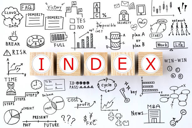 Wooden blocks with “INDEX” word and handwritten busines concepts illustration