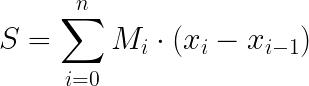 S2= (x1-x0)·f(x1)+(x2-x1)·f(x2)+(x3-x2)·f(x3)+(x4-x3)·f(x4)= (1.5-1)·f(1.5) + (2-1.5)·f(2) + (2.5-2)·f(2.5) + (3-2.5)·f(3) = 0.5 · 2.25 + 0.5 · 4 + 0.5 · 6.25 + 0.5 · 9 = 10.75 u2