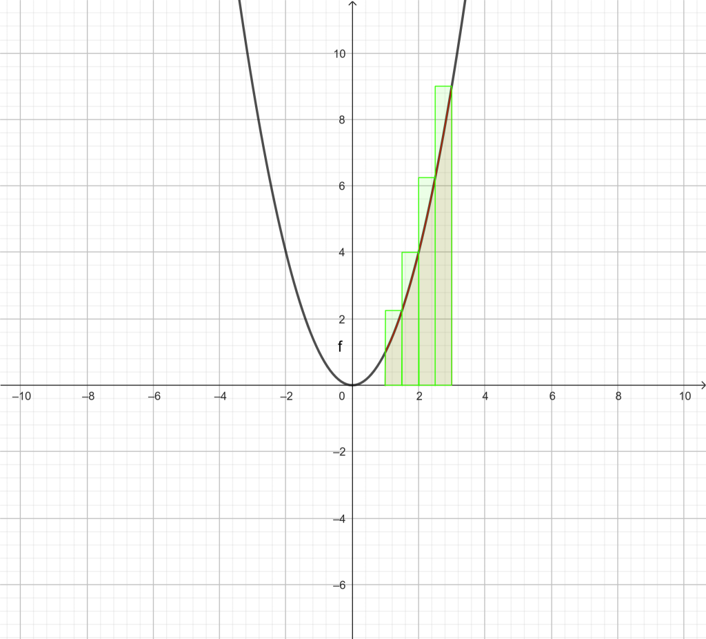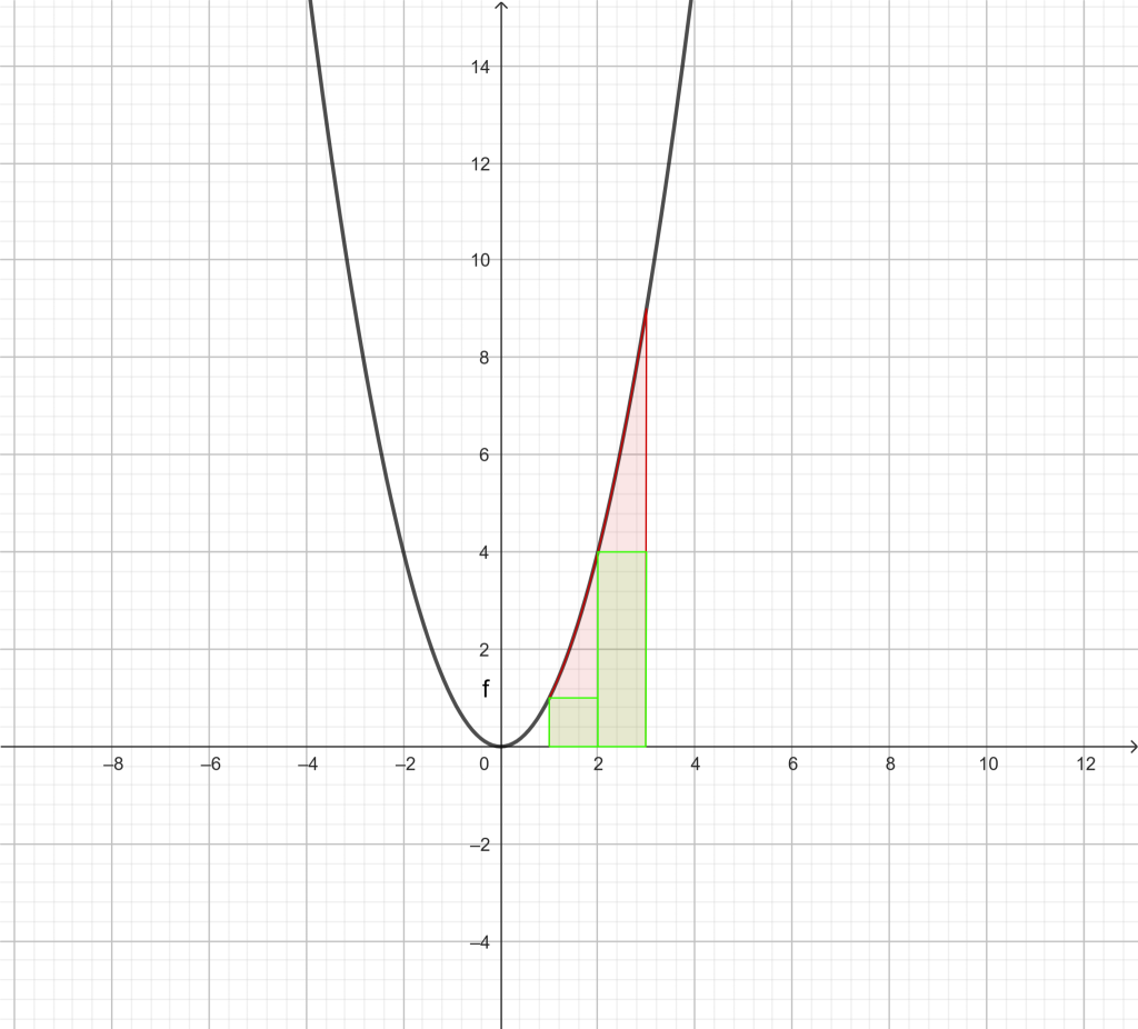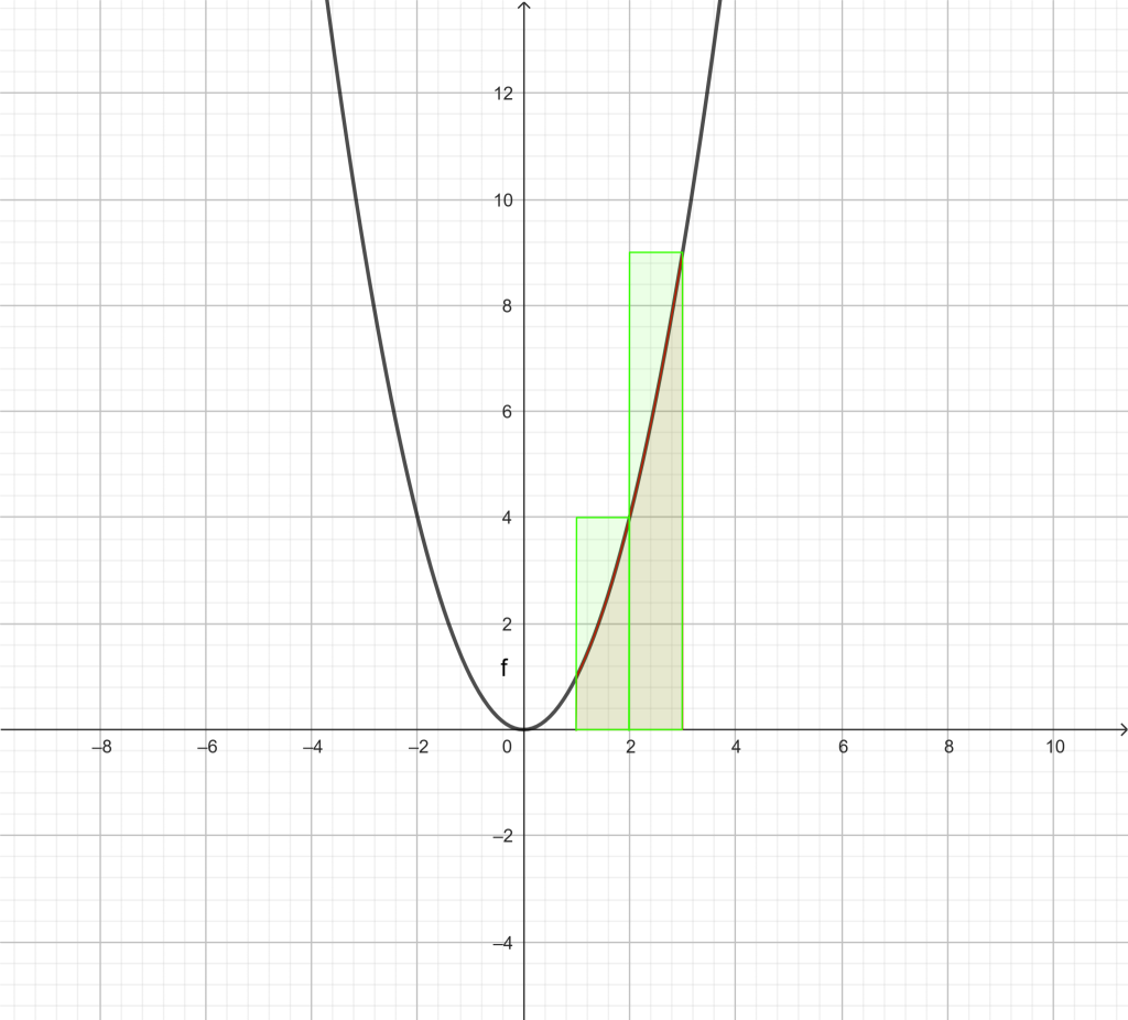 A continuación construimos rectángulos cuyas bases están formadas por los intervalos [1, 2] y [2, 3] considerando como altura la imagen del extremos inferior, como se observa en la figura: