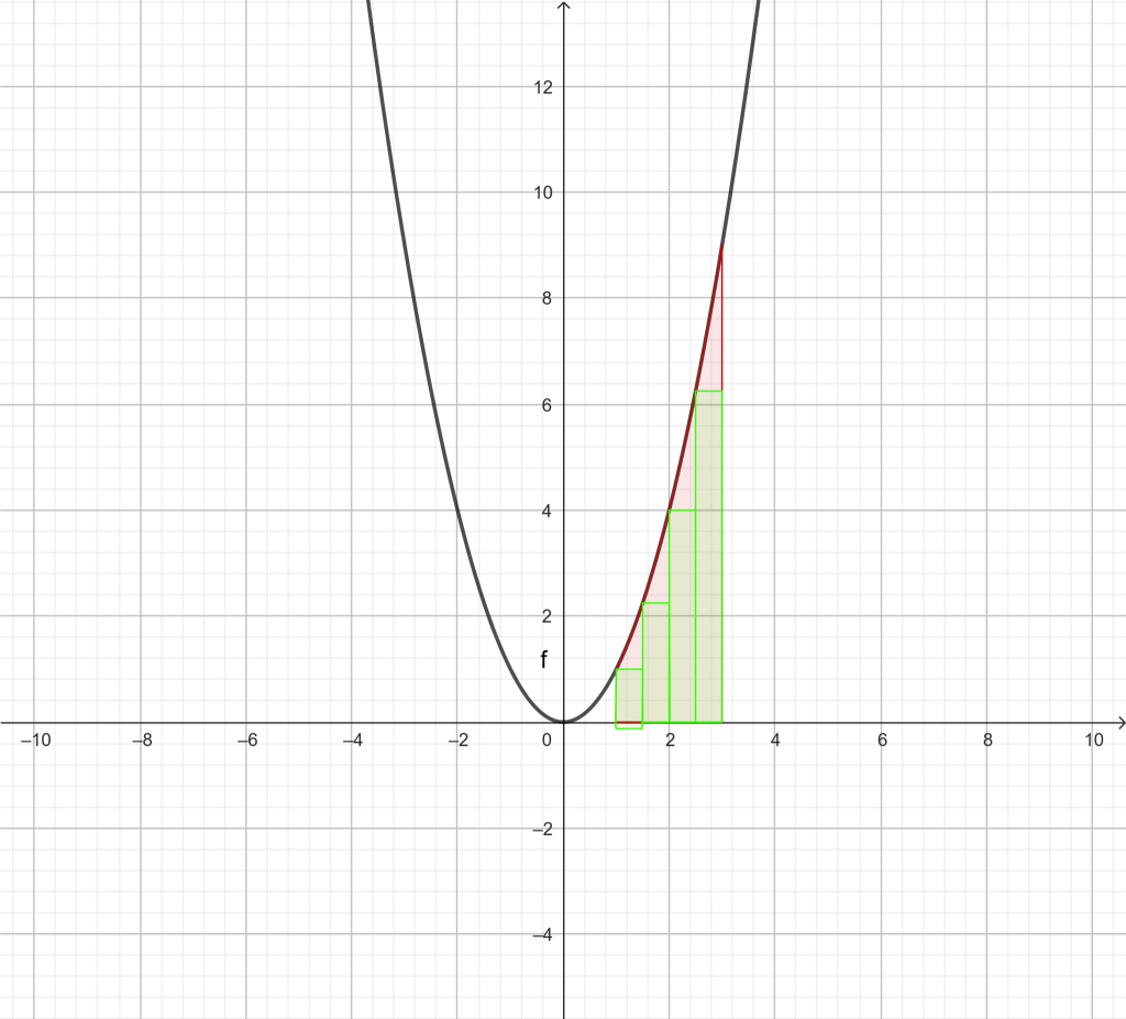 En este caso, la suma de las áreas de los rectángulos, bien sea por defecto o por exceso, se aproxima más al área que queremos calcular, pero aún no coincide.
