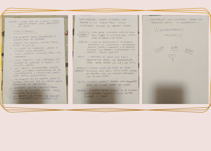 En primer lugar, nos pusimos en contacto con una familia que tenía estos bichos en su casa. No solo nos regalaron algunos ejemplares, sino que además mantuvimos con ellos una conversación en la que nuestro alumnado pudo resolver todas sus dudas: características, alimentación, cuidados, hábitat… ¡Respondieron a todas nuestras preguntas con mucha dedicación!