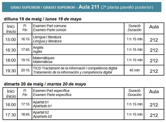 | Aquí tenéis disponible el horario y las aulas donde se realizarán las pruebas de acceso a ciclos formativos de Grado Medio y Superior, los días 19 y 20 de mayo. |