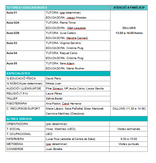 El equipo educativo del CEE Alberto Tortajada es multidisciplinario. Contamos con maestros de Pedagogía Terapéutica, maestras de Audición y Lenguaje, maestros especialistas en Educación Física y Música, profesora de taller y también maestra de Religión. Así mismo tenemos una orientadora a tiempo completo y las visitas semanales de un Trabajador Social. Además, hay educadoras de educación especial que atienen cada una de las aulas junto con una tutora. El centro incorpora también una fisioterapeuta, así como una enfermera escolar que depende del Centro de Salud. Recibimos visitas puntuales de una médica de Consellería. En cuanto al servicio de comedor está atendido por un equipo de 11 monitoras y una pinche de cocina. El transporte escolar cuenta con dos acompañantes.