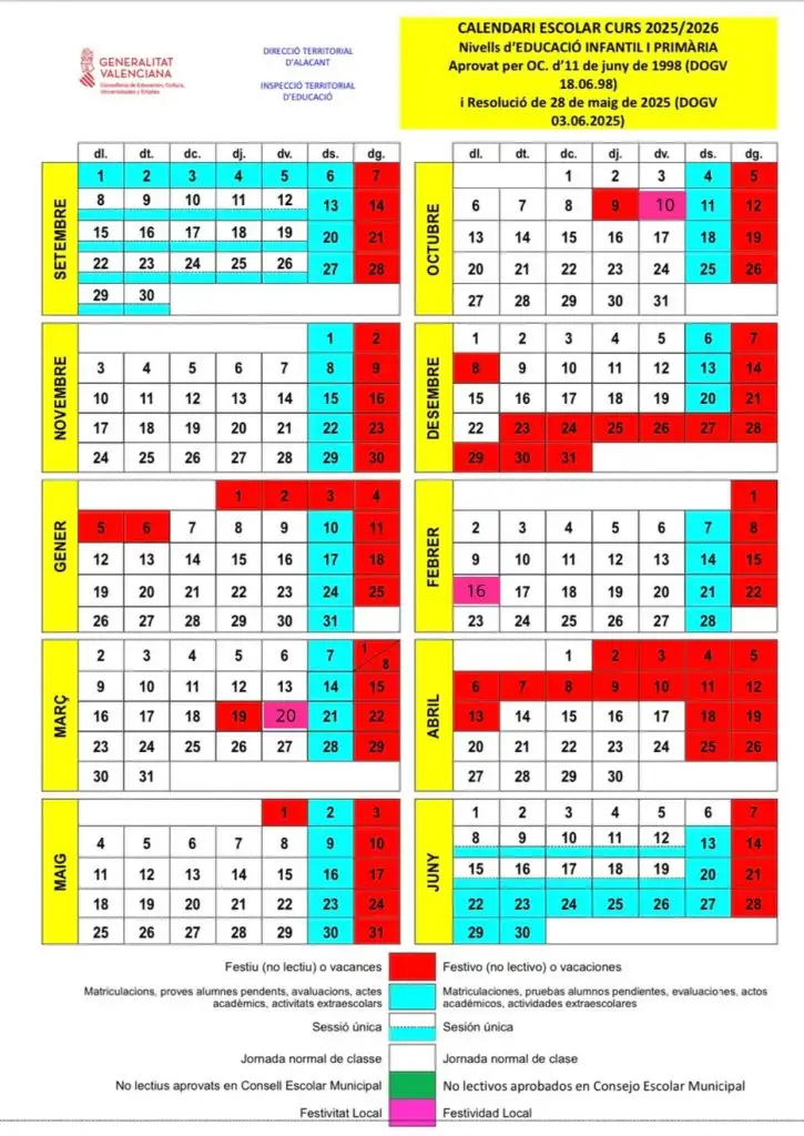 Tal como se establece en la Resolución del 28 de mayo de 2025, se establece el siguiente calendario escolar: