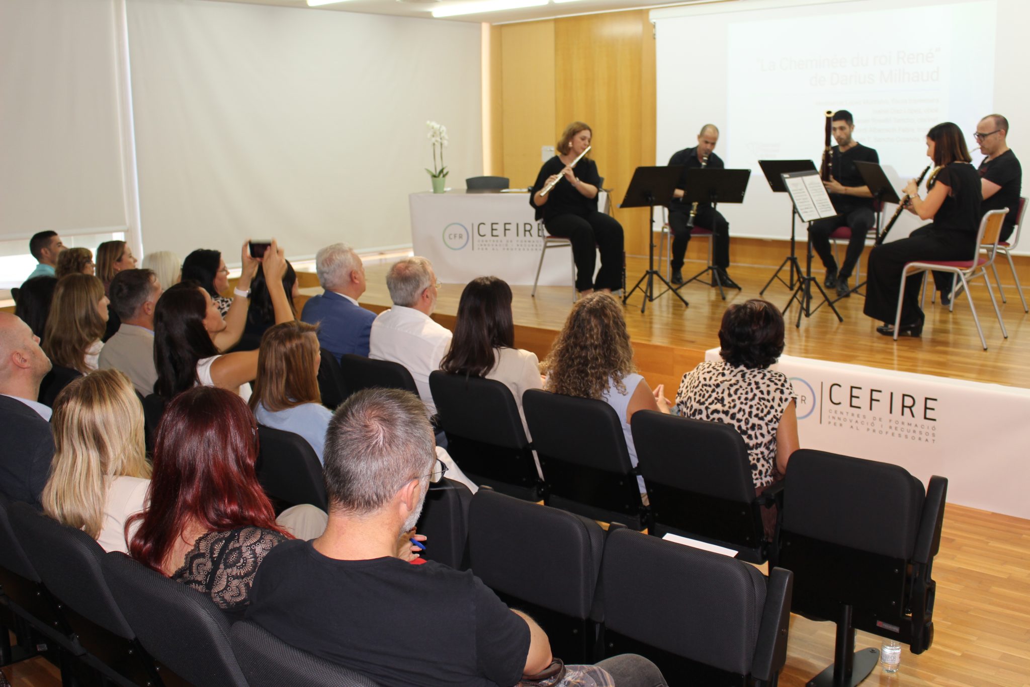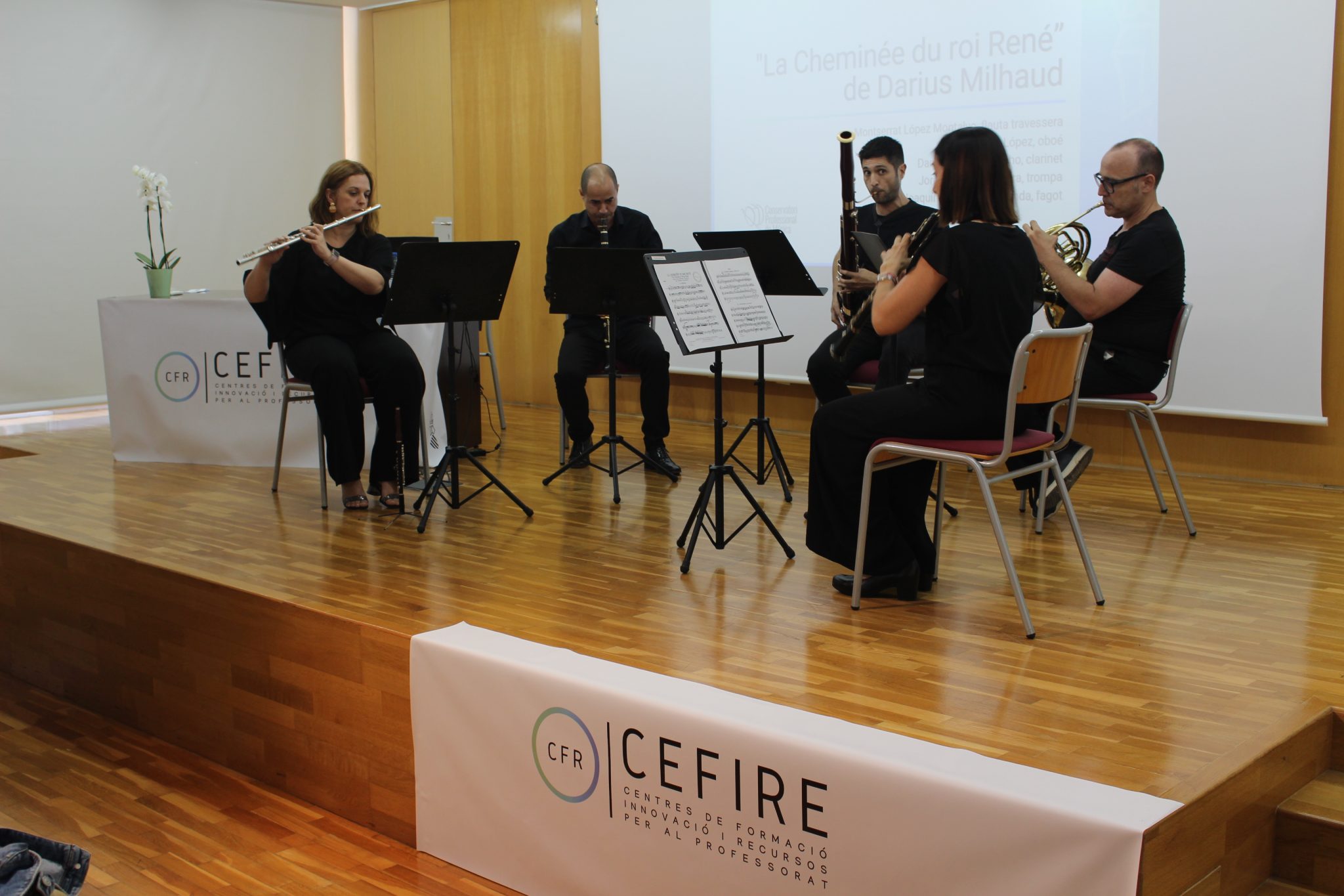 Finalment, un quintet de vent compost per professorat del Conservatori Professional de Música d’Elx va posar el colofó a la jornada, al saló d’actes, que va concloure amb una visita a les instal·lacions del CEFIRE i un vi d’honor a la Mediateca de l’EOI per a totes les persones assistents.