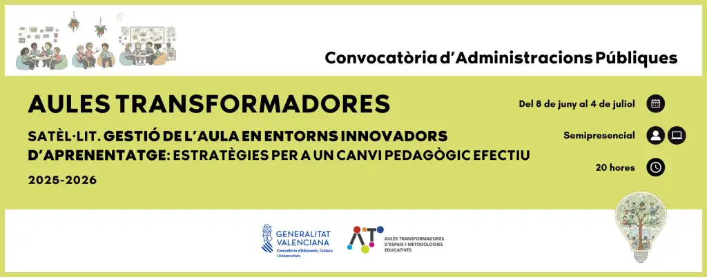 Este curs de formació està orientat a proporcionar al professorat estratègies i eines pràctiques per a millorar la gestió de l’aula en contextos educatius innovadors, com ara el model d’Aula Transformadora.