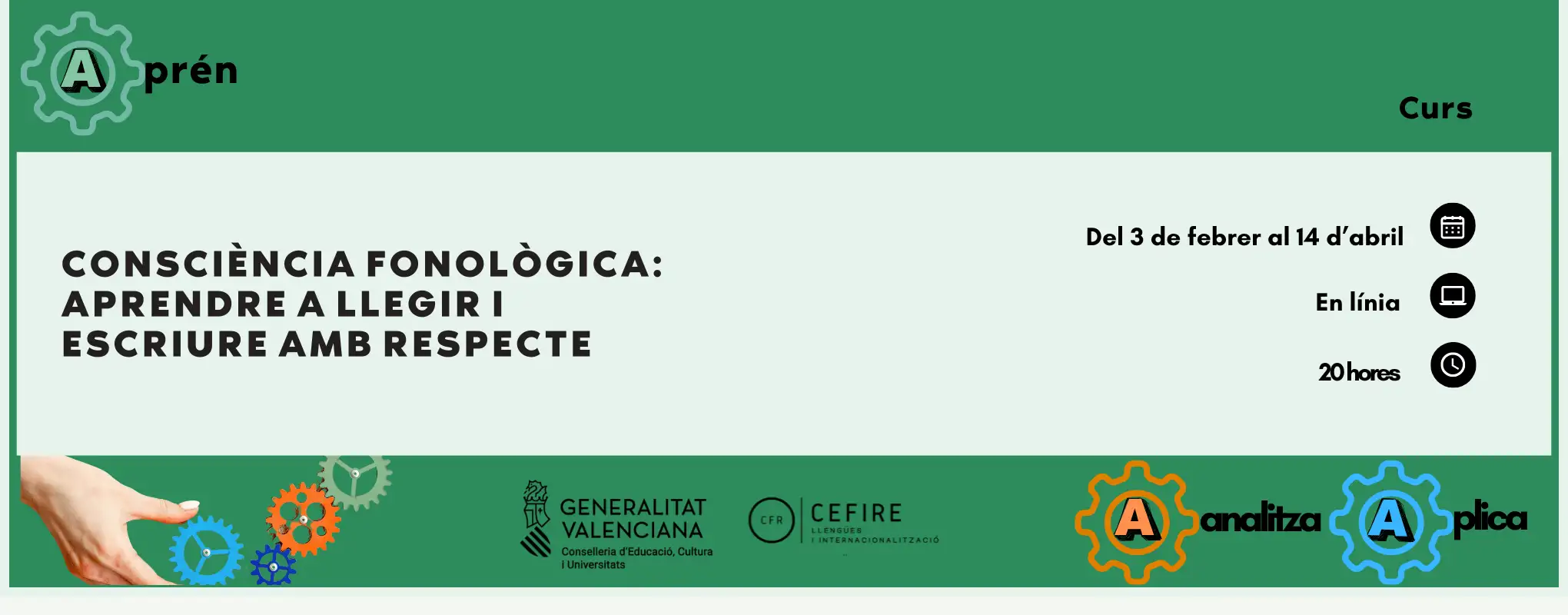 Començar abans no ens garantix l’èxit” és la frase que definix els objectius del curs Consciència fonològica: aprendre a llegir i a escriure amb respecte, una formació pensada per a acompanyar la mirada pedagògica que hem de tindre quan els xiquets i xiquetes s’endinsen en el món de la lectura i l’escriptura. Al llarg del curs es posa el focus en el procés previ al principi alfabètic, combinant fonaments teòrics amb recursos i materials pràctics que permeten ajudar els xiquets a assentar les bases d’una consciència fonològica sòlida, sempre des del respecte als seus ritmes i necessitats.