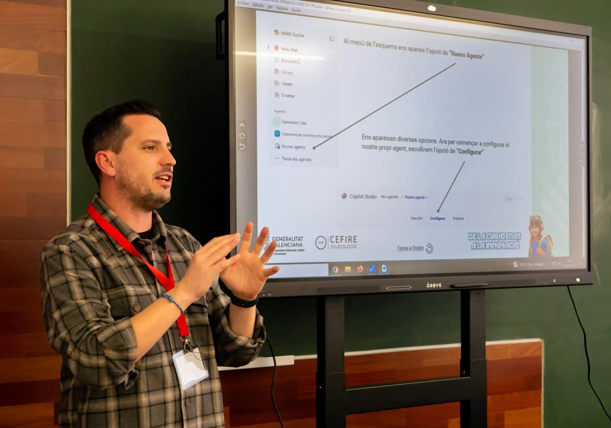 Una de les experiències més cridaneres de la jornada va ser la possibilitat d’interactuar amb l’avatar del CEFIRE d’IA i Pensament Computacional, Ainara, una proposta innovadora que va despertar gran curiositat entre el professorat assistent. La interacció amb Ainara no sols va aportar un component tecnològic atractiu, sinó que també va servir com a exemple pràctic del potencial dels agents virtuals.