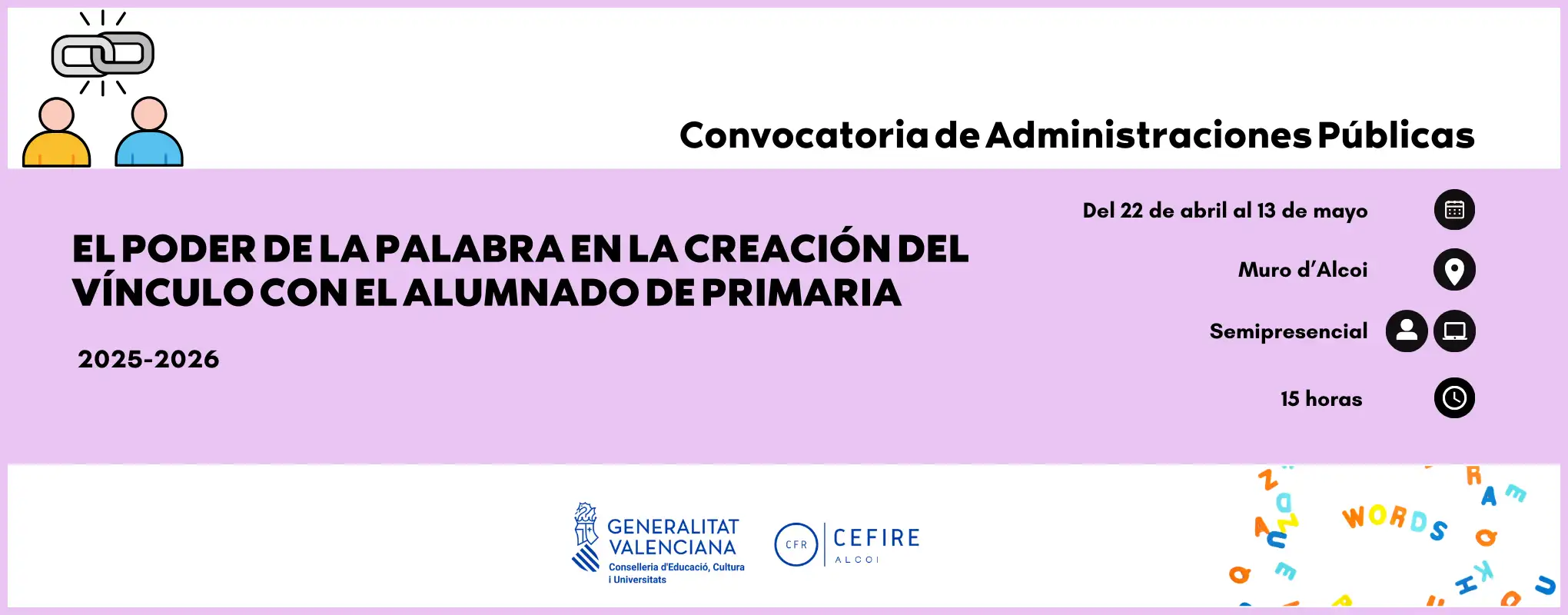 Ofrecemos una formación dinámica e inspiradora pensada para el profesorado que quiere transformar el aula en un espacio vivo, dialogante y competencial. A lo largo de 15 horas, el curso ofrece estrategias prácticas para entender y gestionar la participación desde una base psicológica y neuroeducativa, crear acuerdos de convivencia efectivos y aplicar técnicas concretas que potencian la expresión oral y la implicación real del alumnado. Se trabajarán experiencias de éxito como el World Café, la tertulia dialógica literaria, el teatro para el aprendizaje o el aprendizaje-servicio, combinando sesiones en línea con un encuentro presencial práctico. Una oportunidad para adquirir recursos aplicables desde el primer día y reforzar el vínculo pedagógico a través del poder de la palabra.