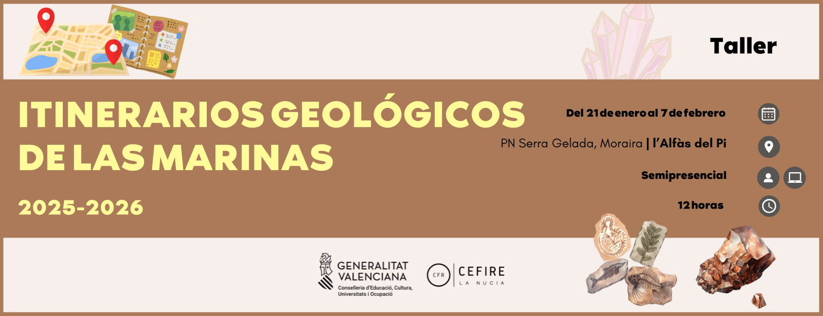 En esta formación aprenderemos sobre la historia geológica de dos lugares mucho de gran importancia en las Marines: la Sierra Helada, donde realizaremos una paseada desde la playa del rincón del Albedrío hasta el faro de la punta Bombarda; la costa de Teulada-Moraira, donde conoceremos los recursos geológicos más importantes en un recorrido a borde mar.