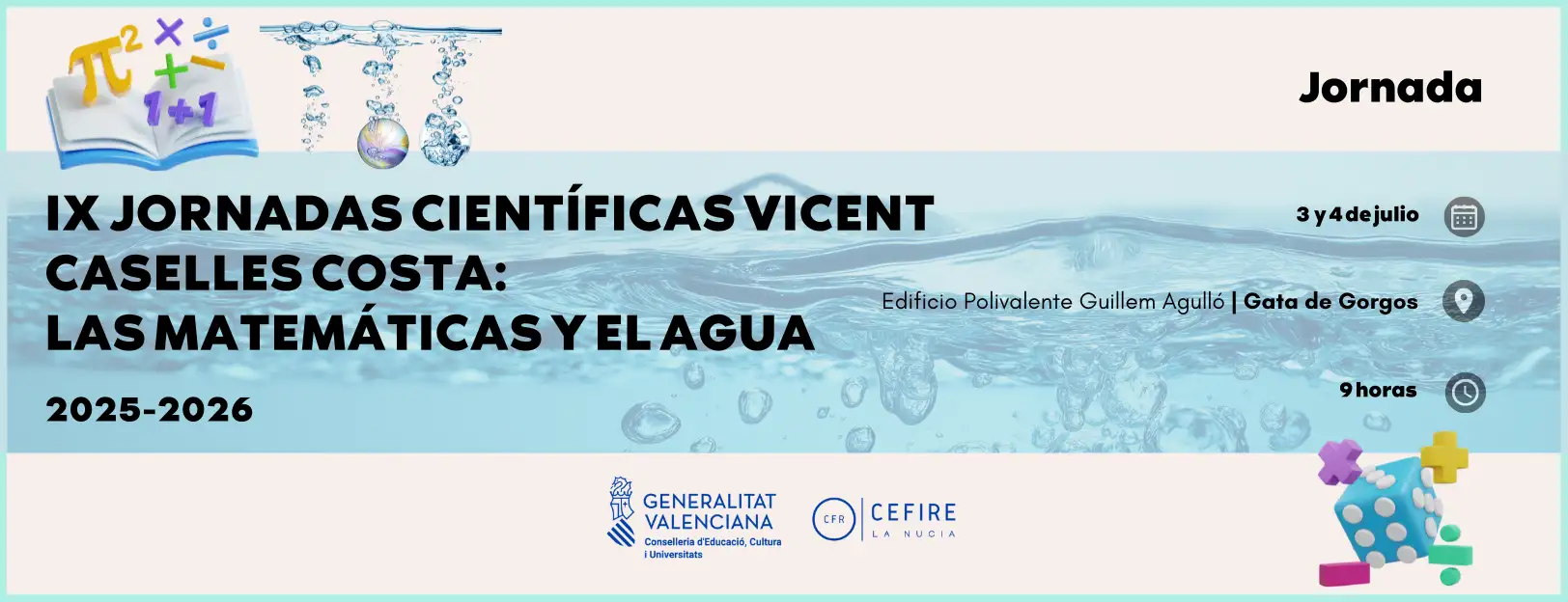 Esta jornada tratará la relación existente entre las matemáticas y el agua. Será un encuentro de divulgación y reflexión que explora el papel de las matemáticas en el estudio, la gestión y la comprensión de los sistemas relacionados con el agua. A través de ponencias y actividades, la jornada muestra como los modelos matemáticos ayudan a analizar fenómenos como el ciclo del agua, los flujos hidrológicos, la predicción de riadas o la gestión sostenible de los recursos hídricos, destacando la conexión entre investigación científica, territorio y sociedad.