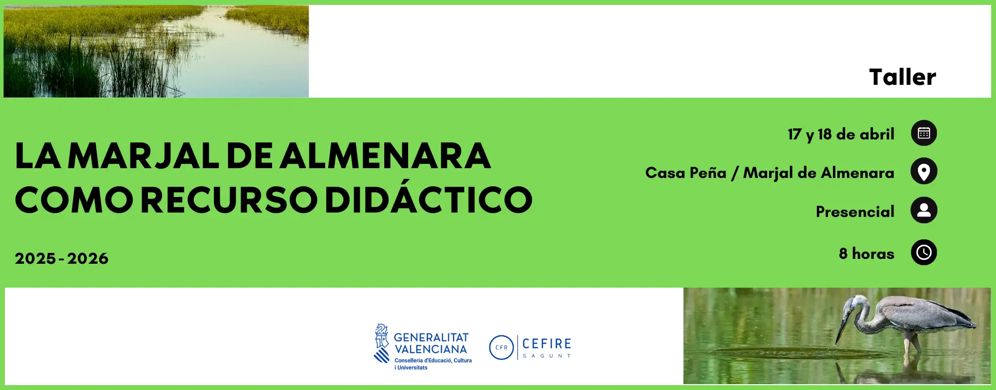 Desde el ámbito de Sostenibilidad, el CEFIRE de Sagunto ofrece esta formación de 8 horas para descubrir el valor ecológico, cultural y educativo del marjal de Almenara, un espacio natural clave del territorio 🌍. El curso acerca al profesorado a la importancia de las zonas húmedas, sus figuras de protección y el papel de la sociedad civil en la conservación del paisaje.