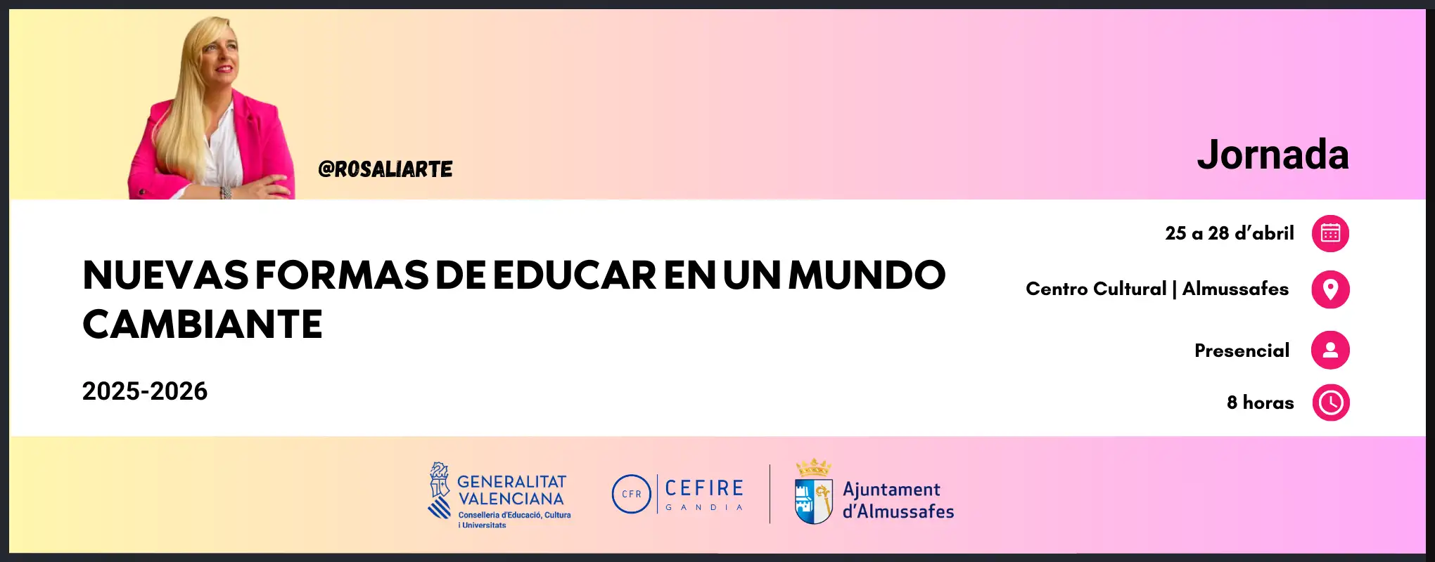 Esta Jornada de 8 horas que impartirá la ponente Rosa Liarte @rosaliarte, docente, creadora de contenido educativo y referente en innovación, está enmarcada dentro de “Almussafes Ciudad educadora” en colaboración con el CEFIRE de Gandía. Consta de un día presencial y uno a distancia con el siguiente programa: