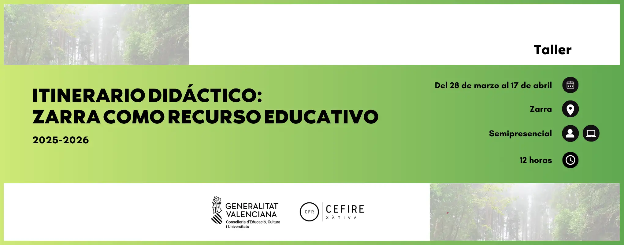 ¿Quieres convertir la natura en una aula viva? Este curso te invita a descubrir las potencialidades didácticas de Zarra y su entorno como recurso educativo para el aprendizaje fuera del aula. Mediante una ruta gamificada, aprenderás a integrar contenidos de geografía, ciencias naturales, economía rural y etnografía en actividades lúdicas que fomentan la curiosidad y el respeto por el medio ambiente.