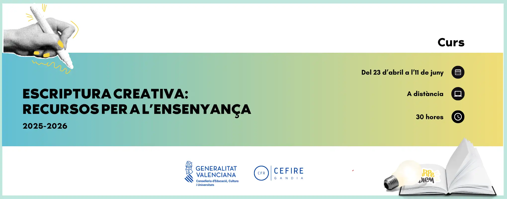 En este curs explorarem experiències, estratègies i recursos pedagògics per a portar la creació literària a l’aula d’una manera motivadora i significativa. Analitzarem com es construeix un text de ficció -la història, el discurs i la narració- i treballarem la creació d’històries, la construcció del discurs i la perspectiva narrativa del relat. També reflexionarem sobre la relació entre llengua, literatura i valors en el procés educatiu. Finalment, veurem com aplicar l’escriptura creativa a l’ensenyament per a dinamitzar les competències orals i escrites. Una proposta pràctica i inspiradora per a transformar l’aula en un espai de creació i expressió.