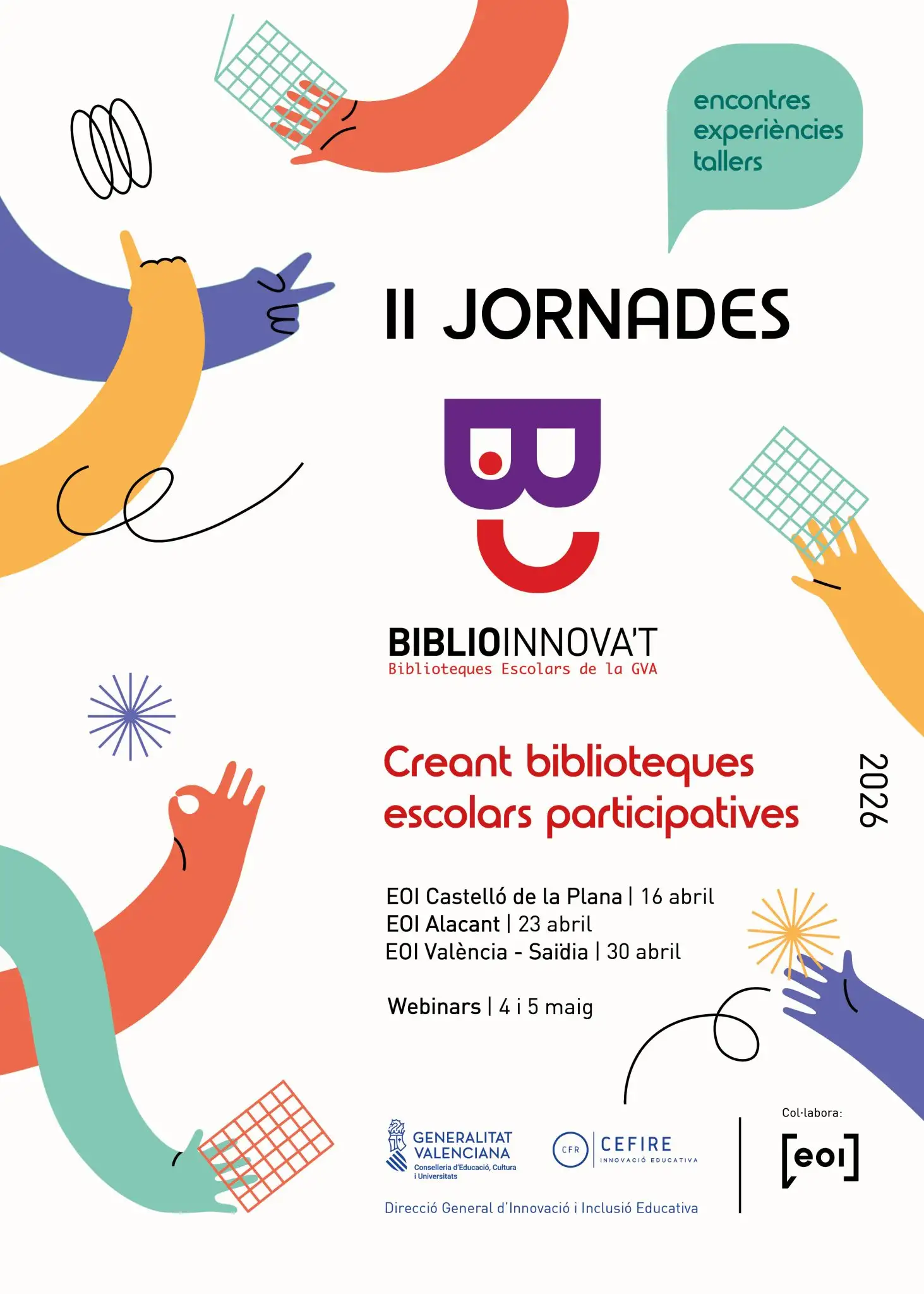 Amb la participació com a eix conductor, s’han triat experiències de biblioteques rellevants de cadascuna de les tres províncies, on docents de centres educatius de nivells i etapes educatives diferents (CEIP, IES, CRA, CEE i EI) donaran a conéixer els seus projectes.