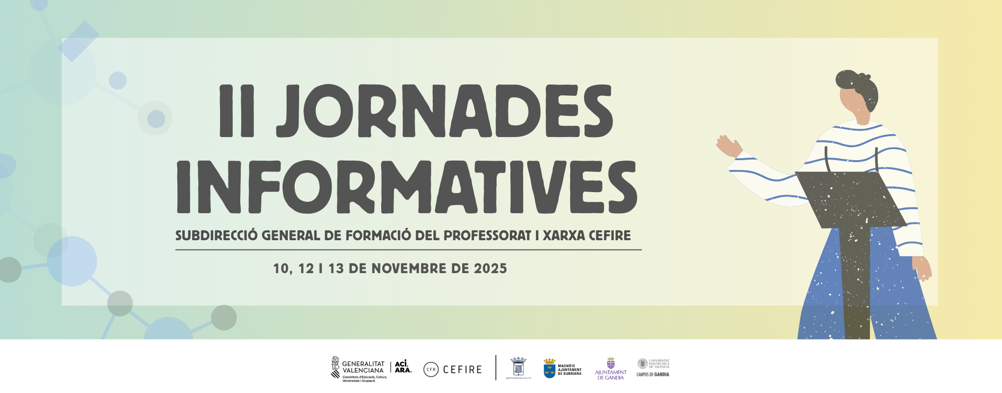 Des de la Subdirecció General de Formació del Professorat estem organitzant novament les Jornades Informatives, que tindran lloc durant el mes de novembre en les localitats següents: La Nucia (dia 10), Borriana (dia 12) i Gandia (dia 13).