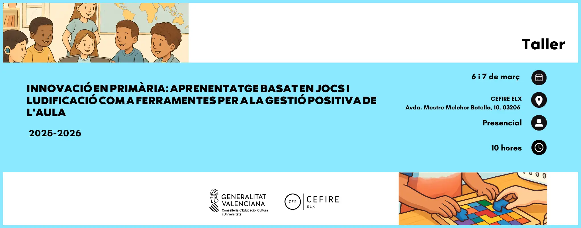 Innovació en Primària: Aprenentatge Basat en Jocs i Ludificació com a Ferramentes per a la Gestió Positiva de l’Aula és el tema central d’este taller dissenyat per a docents que desitgen incorporar metodologies lúdiques en la seua pràctica educativa. Amb l’objectiu de millorar la motivació i la convivència a l’aula, s’exploraran estratègies que combinen l’aprenentatge basat en jocs i la ludificació com a ferramentes eficaces per a la gestió positiva i el desenrotllament integral de l’alumnat.