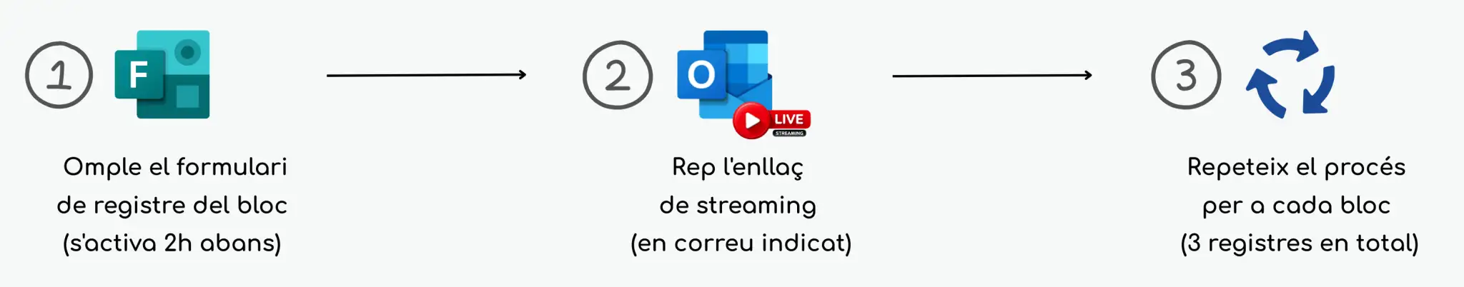 - Tindre en compte que els formularis de registre s’activaran amb 2 hores d’antelació a l’inici de cada retransmissió.