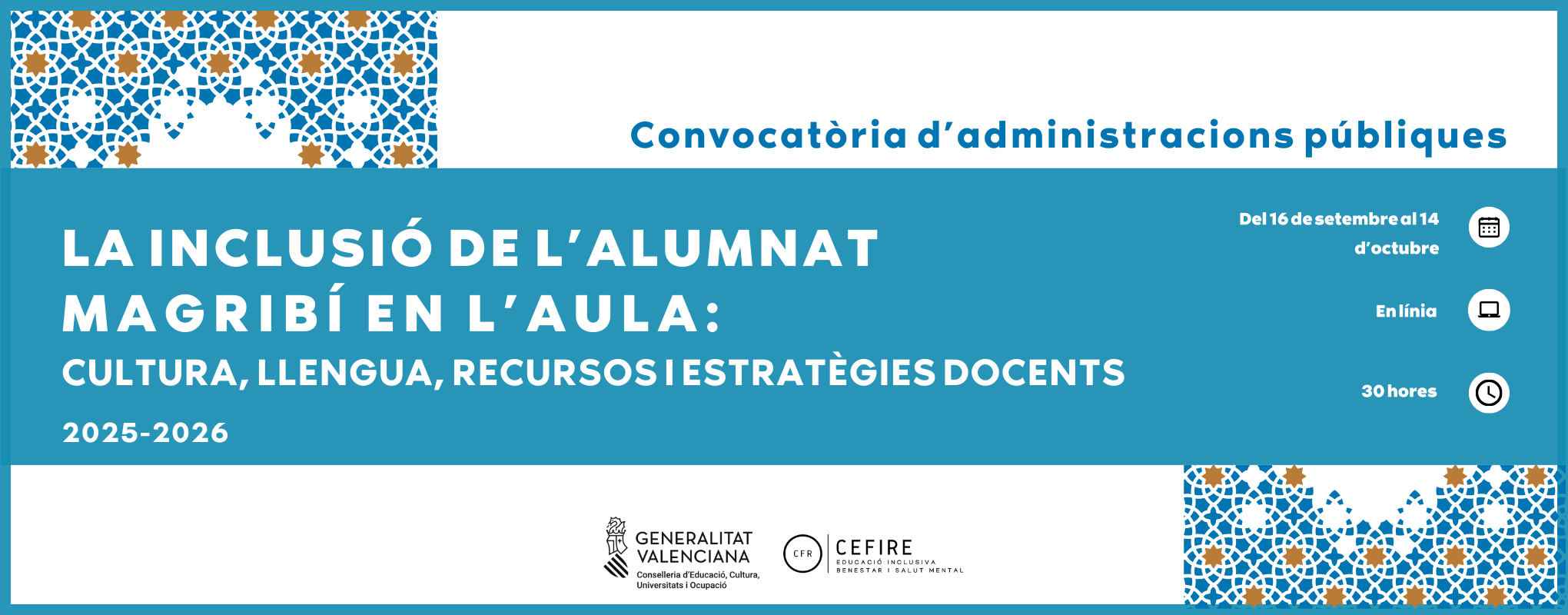 El curs "La inclusió de l'alumnat magribí a l'aula: cultura, llengua, recursos i estratègies docents" té com a objectiu facilitar la inclusió de l’alumnat magribí en l’entorn escolar, respectant la seua identitat cultural i lingüística. Es proporcionen eines per millorar la comunicació a l’aula i estratègies per a l’ensenyament del valencià i castellà com a segona llengua, afavorint un aprenentatge equitatiu.